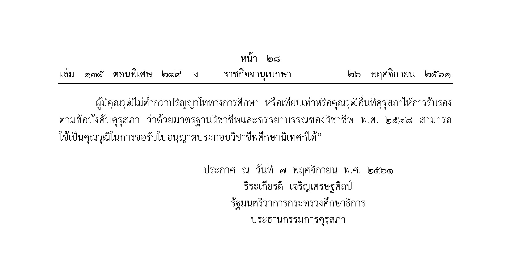 เมื่อวันที่ 26 พฤศจิกายน 2561 เว็บไซต์ราชกิจจานุเบกษา ได้เผยแพร่ ข้อบังคับคุรุสภา ว่าด้วยมาตรฐานวิชาชีพ (ฉบับที่ 3) พ.ศ.2561 โดยมีรายละเอียด ดังนี้