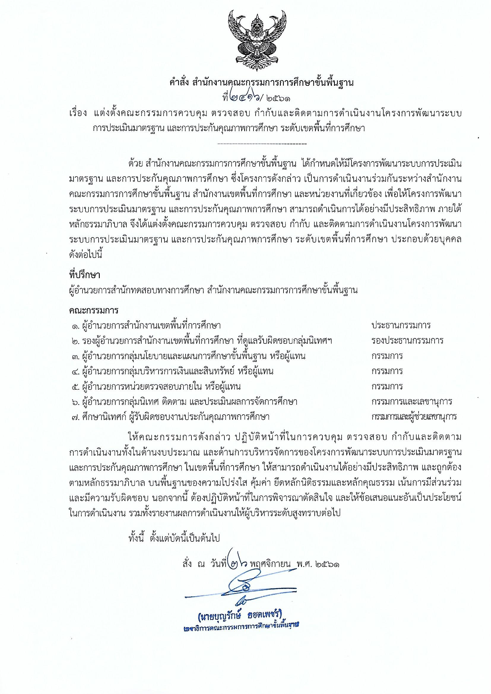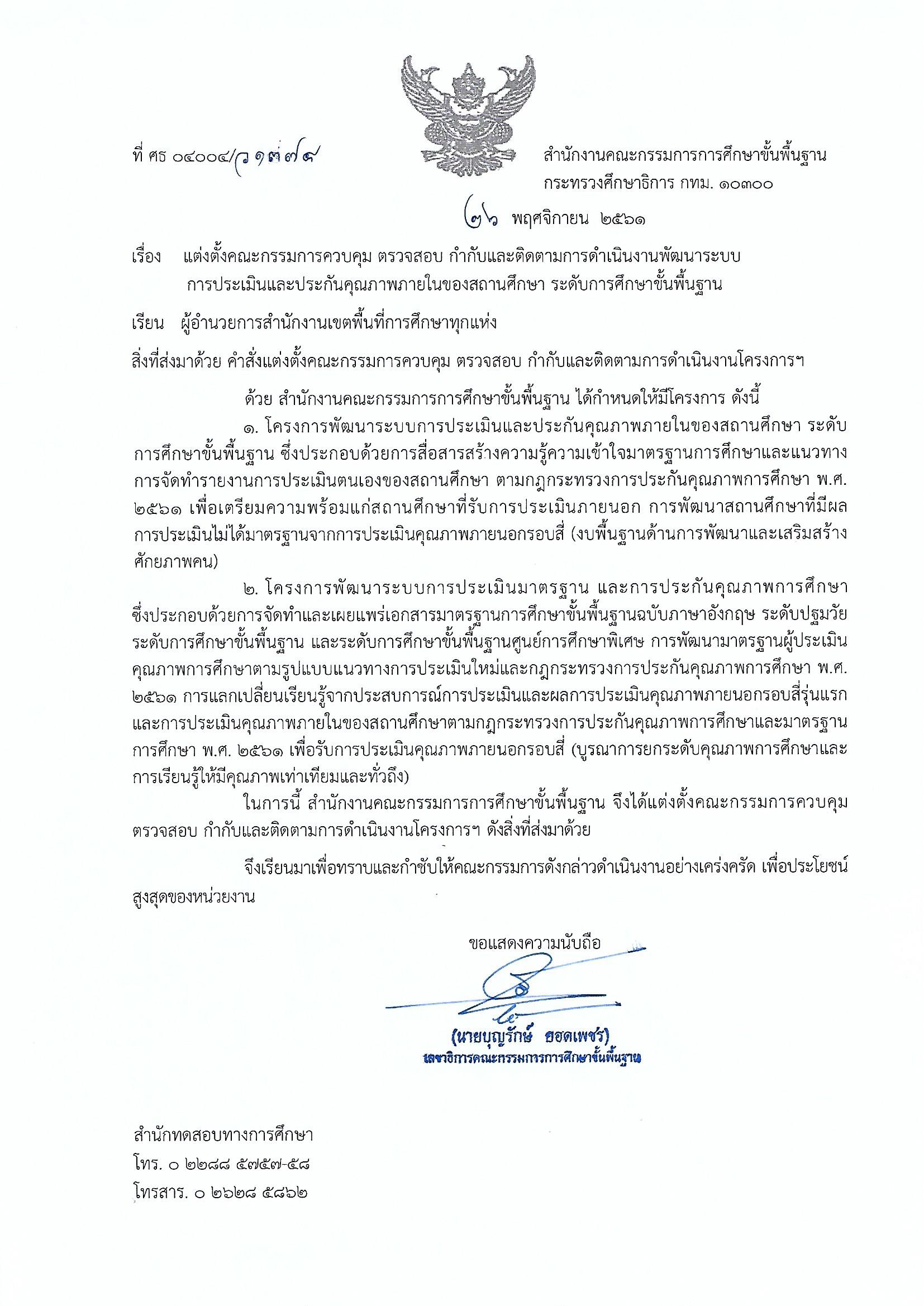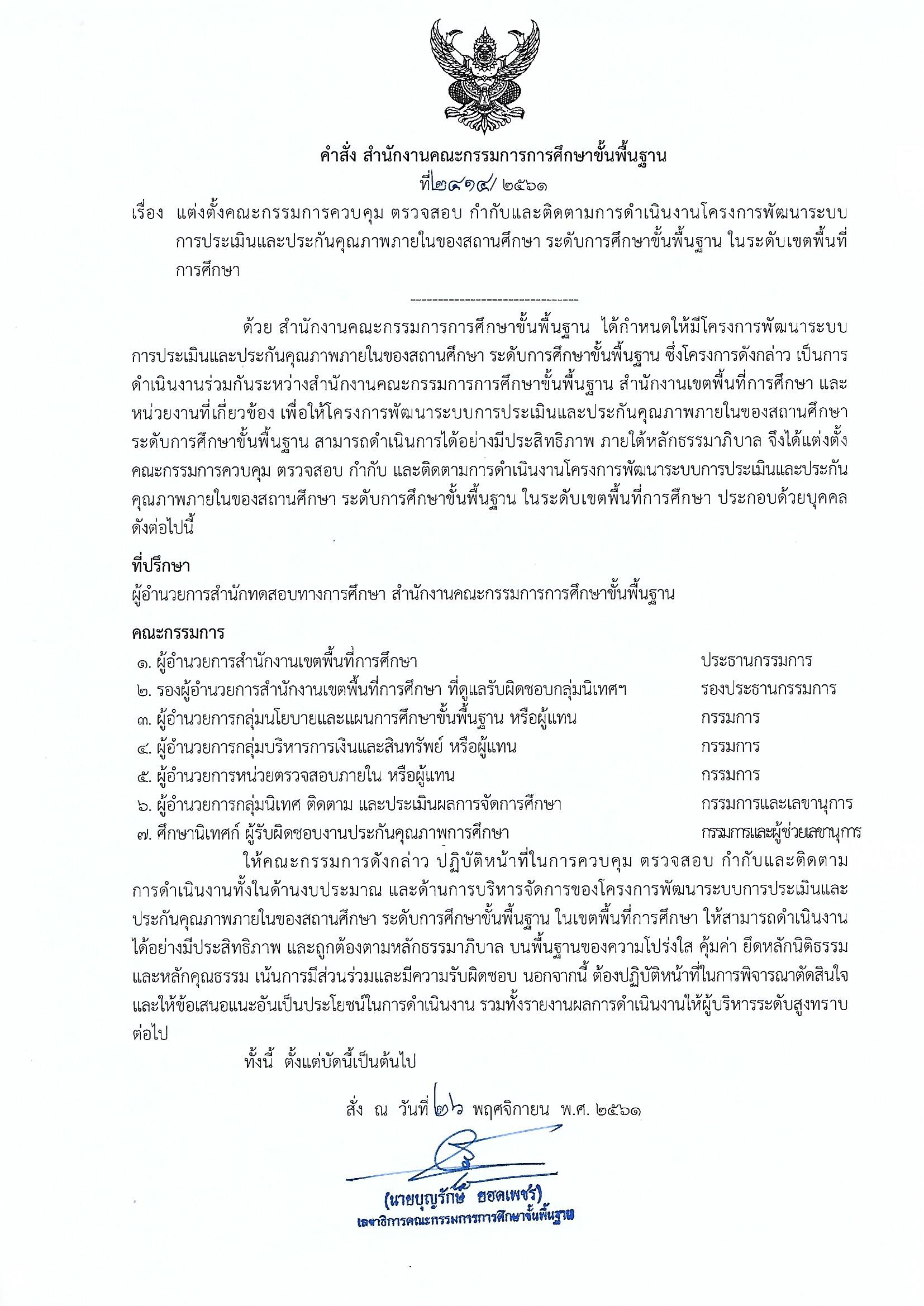 สำนักงานคณะกรรมการการศึกษาขั้นพื้นฐาน มีคำสั่ง แต่งตั้งคณะกรรมการควบคุม ตรวจสอบ กำกับและติดตามการดำเนินงานโครงการพัฒนาระบบการประเมินและประกันคุณภาพภายในของสถานศึกษา ระดับการศึกษาขั้นพื้นฐาน โดยมีรายละเอียด ดังนี้