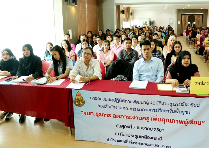 วันที่ 7 ธันวาคม 2561 ที่ห้องประชุมเหลืองกระบี่ สำนักงานเขตพื้นที่การศึกษาประถมศึกษากระบี่ นายบำรุง ฤทธิรัตน์ ผู้อำนวยการสำนักงานเขตพื้นที่การศึกษาประถมศึกษากระบี่ เป็นประธานอบรมเชิงปฏิบัติการพัฒนาผู้ปฏิบัติงานธุรการโรงเรียนในสังกัดทุกโรง ๆ ละ 1 คน จำนวน 211 คน พร้อมกับเขตพื้นที่การศึกษาอื่นทั่วประเทศ เพื่อเสริมสร้างความรู้ความเข้าใจบทบาทหน้าที่และปฏิบัติงานได้อย่างถูกต้องตามมาตรฐานการปฏิบัติงานที่กำหนด รวมถึงความรู้ทั่วไปเกี่ยวกับ New DLTV, PLC และการสร้างเครือข่าย จากคณะศึกษานิเทศก์ สพป.กระบี่ ระบบงานสารบรรณอิเล็กทรอนิกส์ งานข้อมูลสารสนเทศ จากกลุ่มนโยบายและแผน เพื่อช่วยสนับสนุนการยกระดับคุณภาพการศึกษาของนักเรียน “เจ้าหน้าที่ธุรการ ลดภาระงานครู เพิ่มคุณภาพผู้เรียน” และรับฟังถ่ายทอดสดผ่านวีดีโอคอนเฟอเรนท์ในเรื่องนโยบายกระทรวงศึกษาธิการการจากนายแพทย์ธีระเกียรติ เจริญเศรษฐศิลป์ และการนำนโยบายสู่การปฏิบัติ จากนายบุญรักษ์ ยอดเพชร เลขาธิการคณะกรรมการการศึกษาขั้นพื้นฐาน