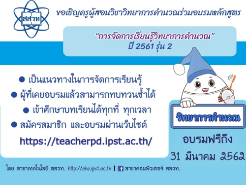สสวท. ขอเชิญชวนครูผู้สอนวิชาวิทยาการคำนวณ สาระเทคโนโลยี กลุ่มสาระการเรียนรู้วิทยาศาสตร์ เข้าร่วมอบรมหลักสูตร “การจัดการเรียนรู้วิทยาการคำนวณ” ปี 2561 รุ่น 2 แบบออนไลน์ ผ่านระบบ IPST LEARNING SPACE ที่