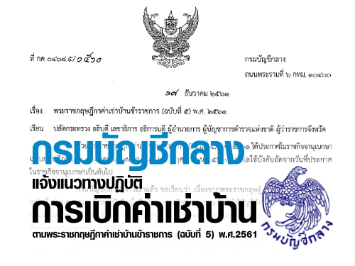 เมื่อวันที่ 18 ธันวาคม 2561 เว็บไซต์กรมบัญชีกลาง ได้เผยแพร่หนังสือ กรมบัญชีกลาง ที่ กค0408.5/ว560 ลงวันที่ 18 ธันวาคม 2561 เรื่อง พระราชกฤษฎีกาค่าเช่าบ้านข้าราชการ (ฉบับที่ 5) พ.ศ.2561 โดยมีเนื้อหาเกี่ยวกับแนวทางปฏิบัติในการเบิกค่าเช่าบ้านข้าราชการในเดือนพฤศจิกายน 2561 ดังนี้