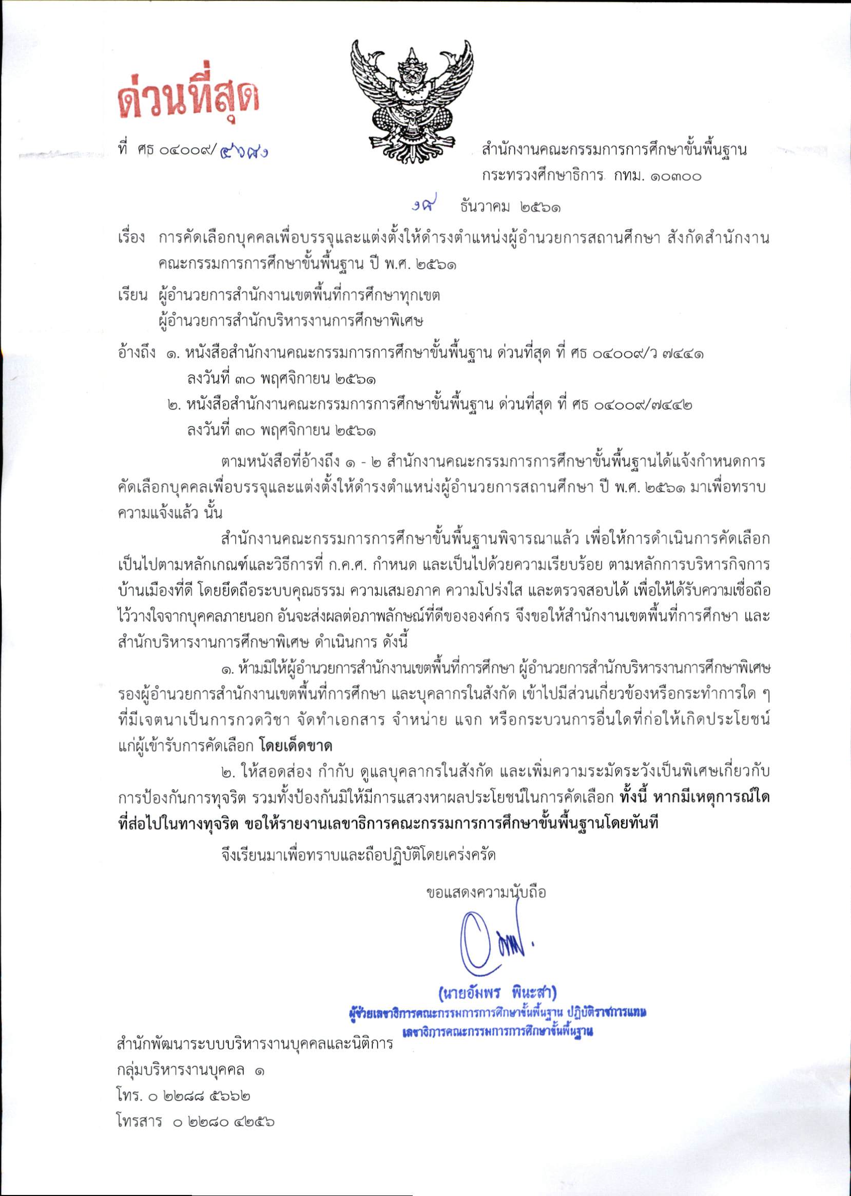 ด่วนที่สุด ที่ ศธ 04009/4681 การคัดเลือกบุคคลเพื่อบรรจุและแต่งตั้งให้ดำรงตำแหน่งผู้อำนวยการสถานศึกษา สังกัด สพฐ. ปี.พ.ศ.2561
