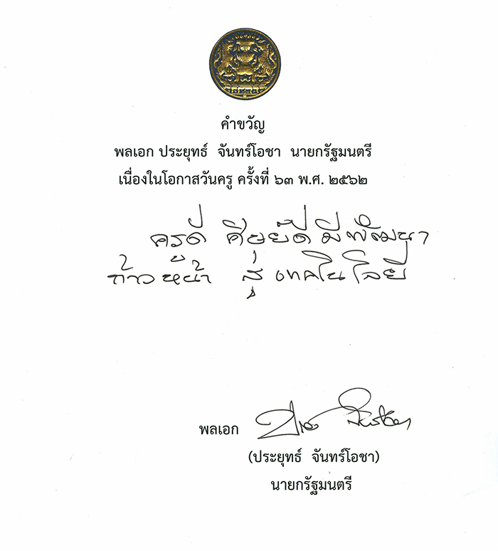 พลเอกประยุทธ์ จันทร์โอชา นายกรัฐมนตรี ได้มอบ “คำขวัญวันครู” ครั้งที่ 63 พ.ศ.2562 ดังนี้