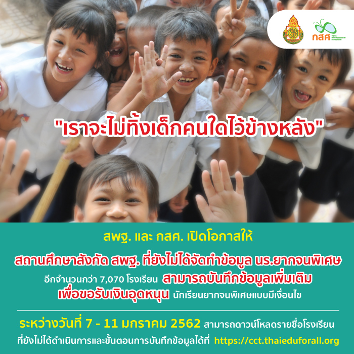 สามารถบันทึกข้อมูลเพิ่มเติมเพื่อขอรับเงินอุดหนุนนักเรียนยากจนพิเศษแบบมีเงื่อนไข ของกสศ.ได้ระหว่าง วันที่ 7-11 มกราคม 2562