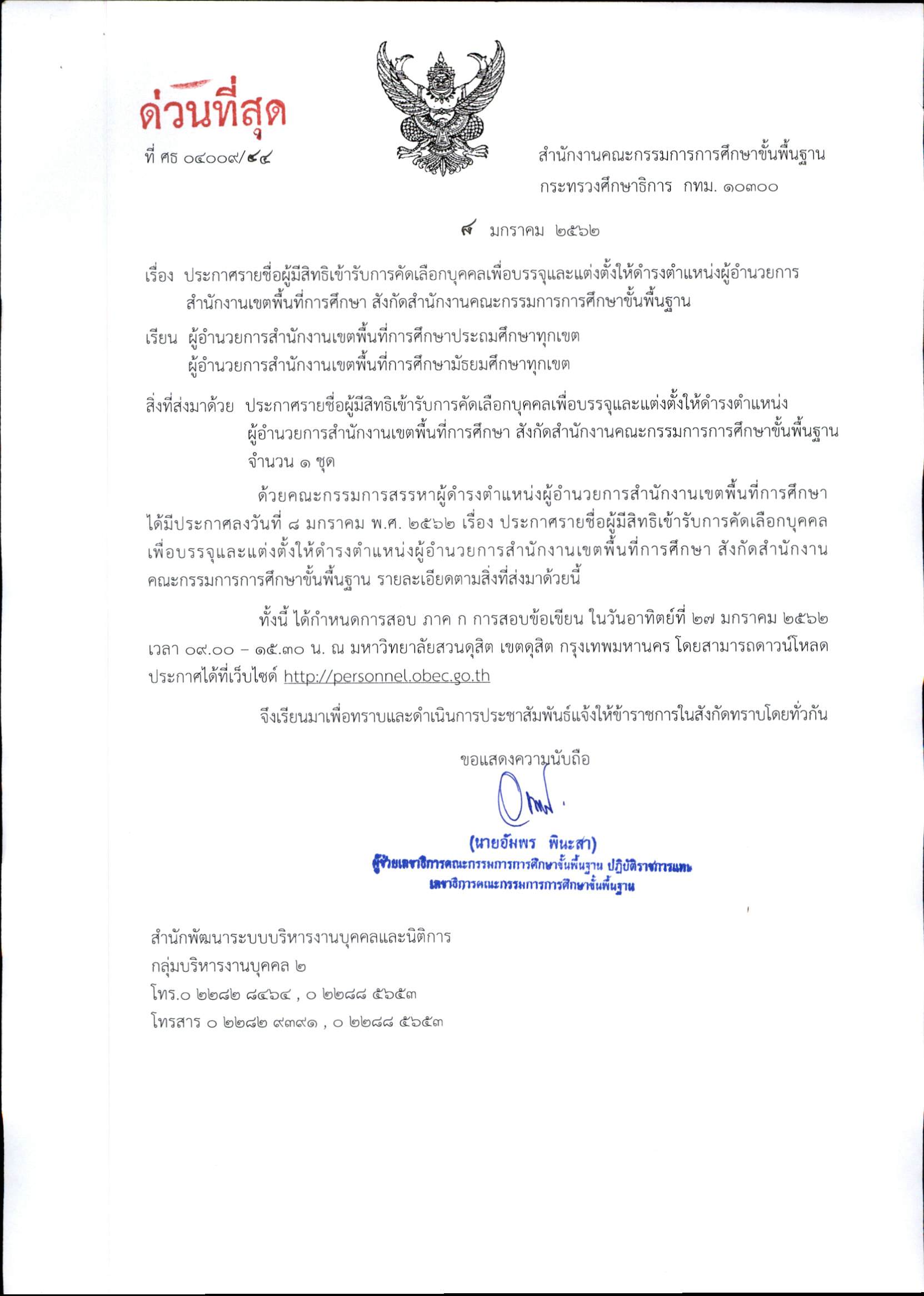 ด่วนที่สุด ที่ ศธ 04009/44 ประกาศรายชื่อผู้มีสิทธิเข้ารับการคัดเลือกบุคคลเพื่อบรรจุและแต่งตั้งให้ดำรงตำแหน่งผู้อำนวยการสำนักงานเขตพื้นที่การศึกษา สังกัด สพฐ.