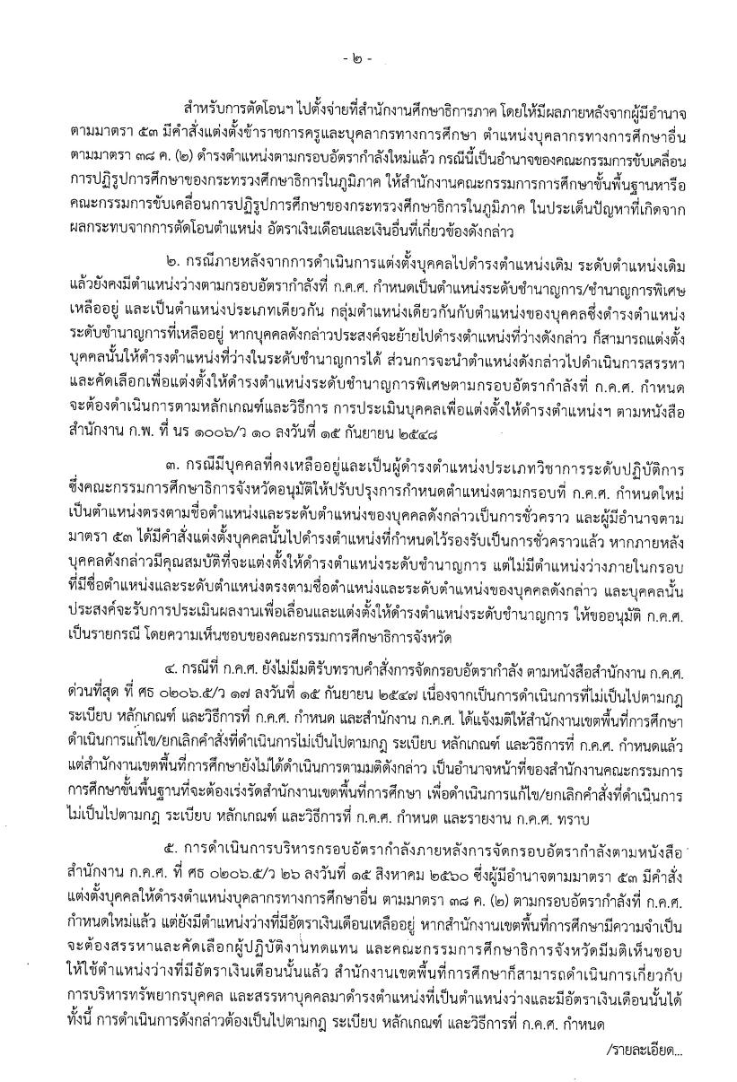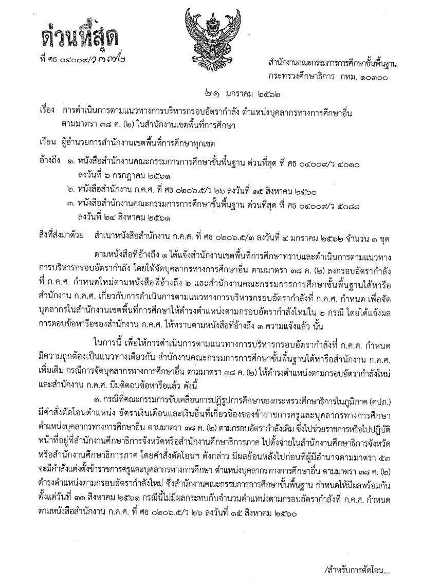 ด่วนที่สุด ที่ ศธ 04009/ว372 เรื่อง การดำเนินการตามแนวทางการบริหารกรอบอัตรากำลัง ตำแหน่งบุคลากรทางการศึกษาอื่นตามมาตรา 38 ค.(2) ในสำนักงานเขตพื้นที่การศึกษา