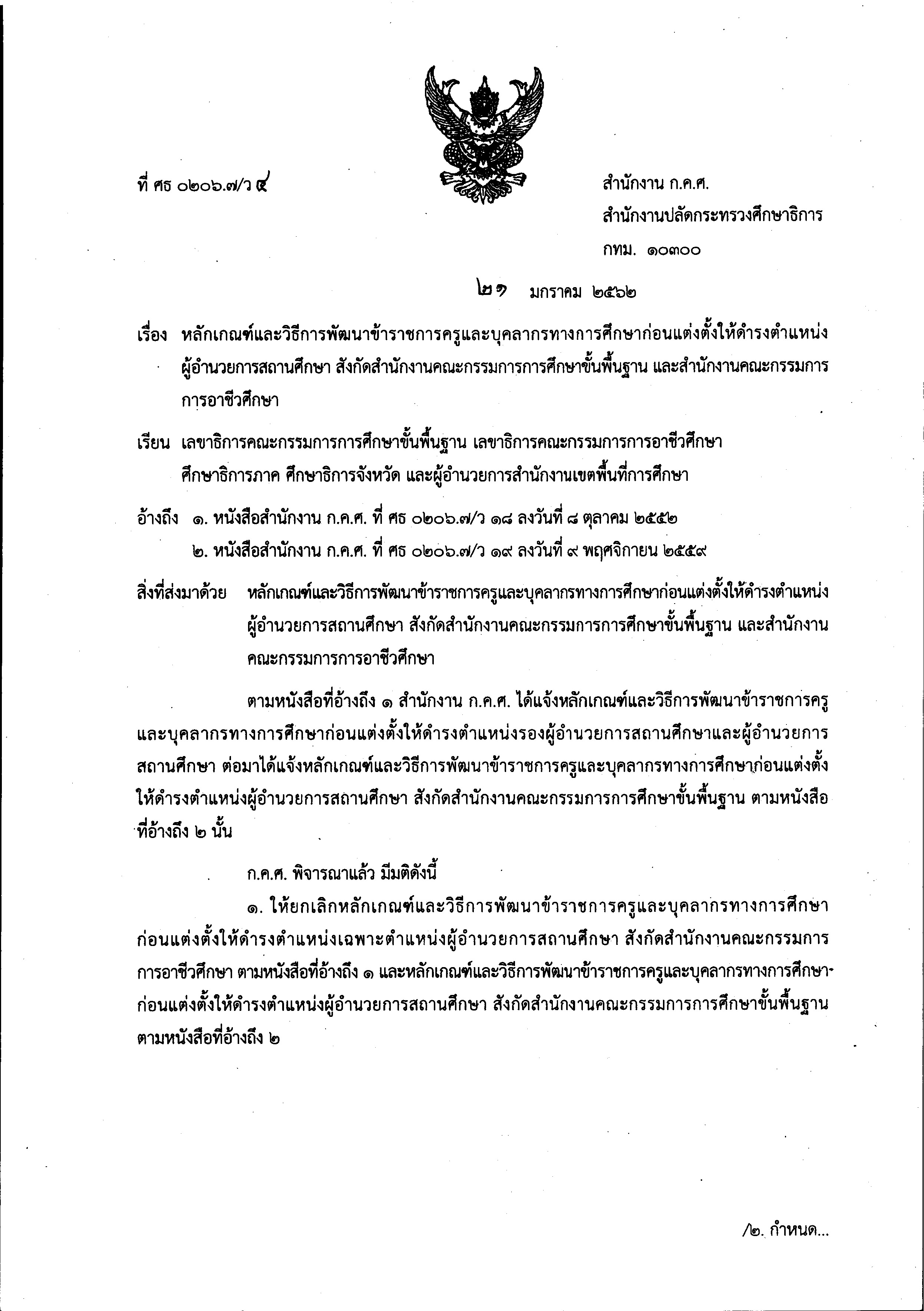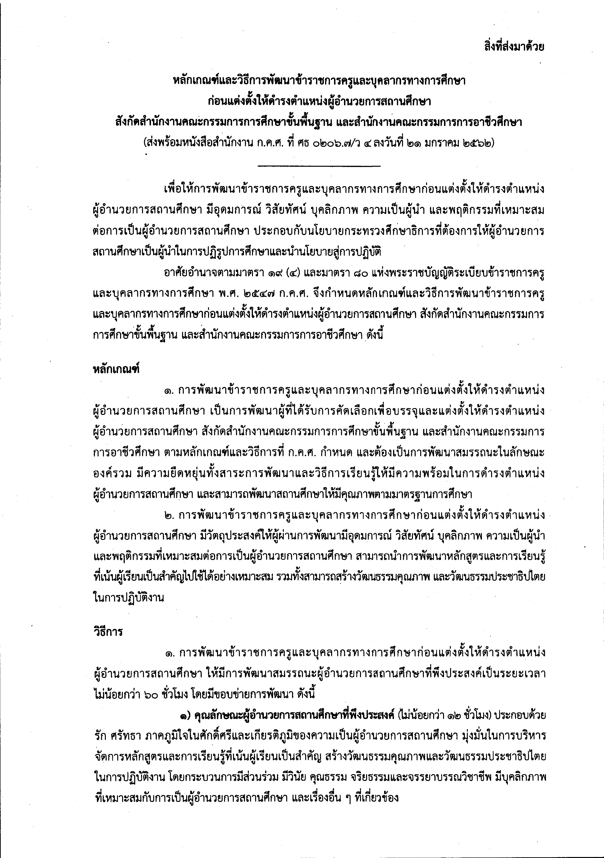 ว 4/2562 หลักเกณฑ์เเละวิธีการพัฒนาข้าราชการครูเเละบุคลากรทางการศึกษาก่อนเเต่งตั้งให้ดำรงตำเเหน่งผู้อำนวยการสถานศึกษา
