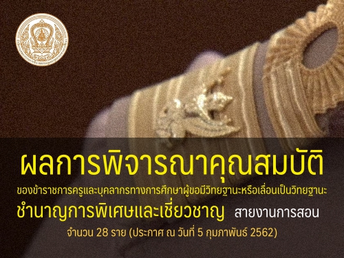 ผลการพิจารณาคุณสมบัติของข้าราชการครูและบุคลากรทางการศึกษาผู้ขอมีวิทยฐานะหรือเลื่อนเป็นวิทยฐานะชำนาญการพิเศษและเชี่ยวชาญ สายงานการสอน 28 ราย ประกาศ ณ วันที่ 5 กุมภาพันธ์ 2562