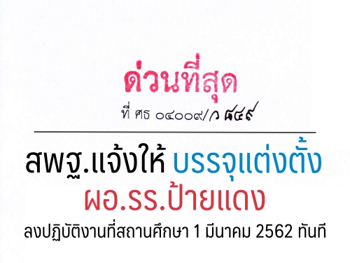 เมื่อวันที่ 8 กุมภาพันธ์ 2562 สำนักงานคณะกรรมการการศึกษาขั้นพื้นฐาน มีหนังสือ ด่วนที่สุด ที่ ศธ 04009/ว 847 ,848, ว 849 เรื่อง การคัดเลือกบุคคลเพื่อบรรจุและแต่งตั้งให้ดำรงตำแหน่งผู้อำนวยการสถานศึกษา สังกัด สพฐ. ปี พ.ศ. 2561 โดยมีรายละเอียด ดังนี้
