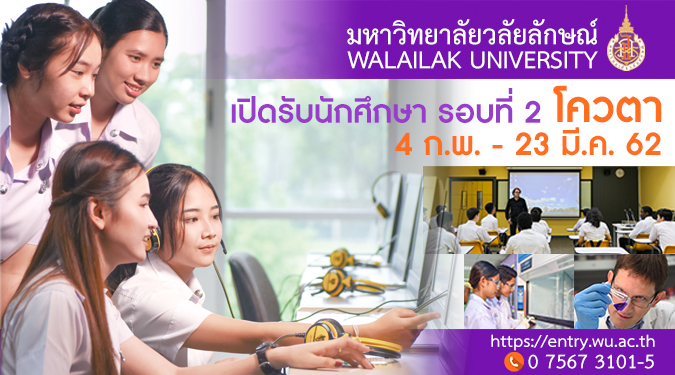 มหาวิทยาลัยวลัยลักษณ์ รับสมัครนักศึกษา TCASรอบ 2 โควตา 14 จังหวัดภาคใต้และจังหวัดประจวบคีรีขันธ์ ผ่านทางระบบอินเทอร์เน็ต http://entry.wu.ac.th จำนวน 2,445 คน ตั้งแต่บัดนี้ถึงวันที่ 23 มีนาคม 2562