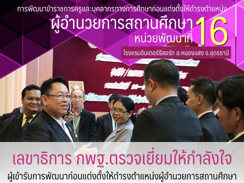 วันที่ 21 กุมภาพันธ์ 2562 ดร.บุญรักษ์ ยอดเพชร เลขาธิการคณะกรรมการการศึกษาขั้นพื้นฐาน ตรวจเยี่ยมให้กำลังใจผู้เข้ารับการพัฒนาก่อนแต่งตั้งให้ดำรงตำแหน่งผู้อำนวยการสถานศึกษา รุ่นที่ 1/2562 หน่วยพัฒนาที่ 16 โรงแรมอินเตอร์รีสอร์ท อ.หนองแสง จ.อุดรธานี โดยมีคณะผู้บริหารโครงการ คณะวิทยากรพี่เลี้ยง รวมทั้งผู้เข้ารับการพัฒนาทั้ง 292 คน ให้การต้อนรับ