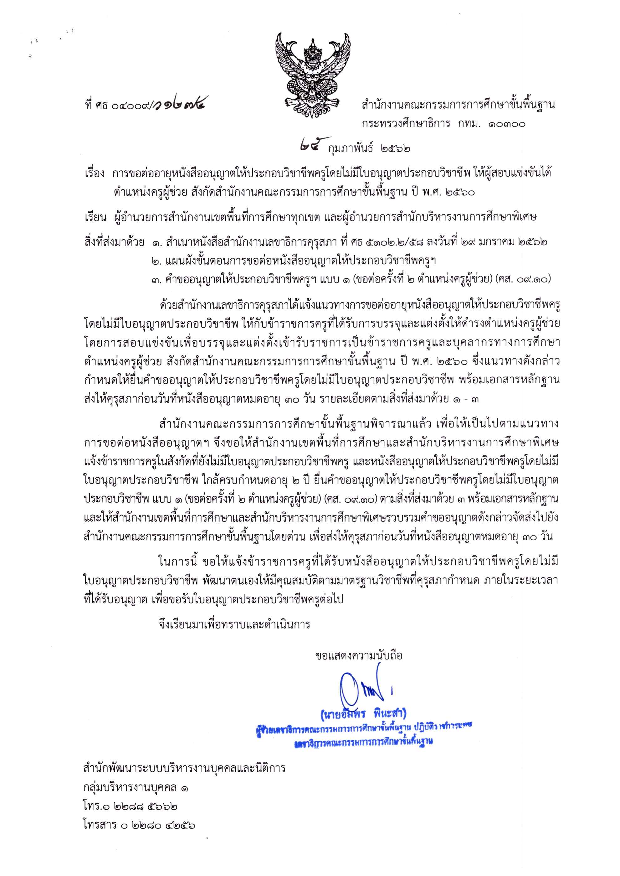ที่ ศธ 04009/ว 1274 เรื่อง การขอต่ออายุหนังสืออนุญาตให้ประกอบวิชาชีพครูโดยไม่มีใบอนุญาตประกอบวิชาชีพ ให้ผู้สอบแข่งขันได้ ตำแหน่งครูผู้ช่วย สังกัด สพฐ. ปี พ.ศ. 2560
