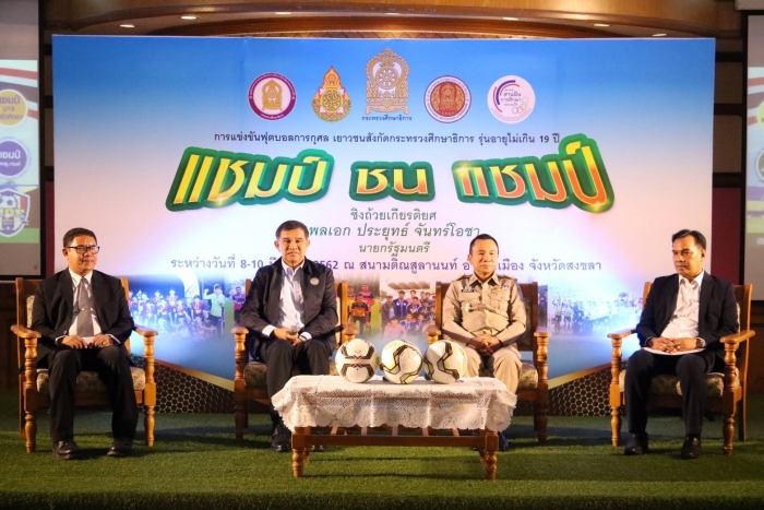 วันนี้(27ก.พ.)ที่โรงแรมหาดแก้วรีสอร์ท อ.สิงหนคร จ.สงขลา พลเอกสุรเชษฐ์ ชัยวงศ์ รัฐมนตรีช่วยว่าการกระทรวงศึกษาธิการ เป็นประธานแถลงข่าวจัดกิจกรรมแข่งขันฟุตบอลการกุศล “แชมป์ ชนแชมป์ MOE CHAMPION CUP 2019 “ ภายใต้ความร่วมมือของกระทรวงศึกษาธิการสมาคมสานฝันการศึกษาชายแดนใต้ และ จังหวัดสงขลา สอดรับกับนโยบายของรัฐบาลในการนำการกีฬาเข้าสู่ระบบการศึกษา รวมทั้งการส่งเสริมนักเรียนที่มีทักษะและความสามารถพิเศษด้านกีฬาอย่างเต็มที่ในโครงการห้องเรียนกีฬา และการเพิ่มพูนศักยภาพนักเรียนที่มีความเป็นเลิศทางด้านกีฬา พร้อมต่อยอดสู่การเล่นกีฬาอาชีพ ในโครงการสานฝันการกีฬาสู่ระบบการศึกษาจังหวัดชายแดนภาคใต้