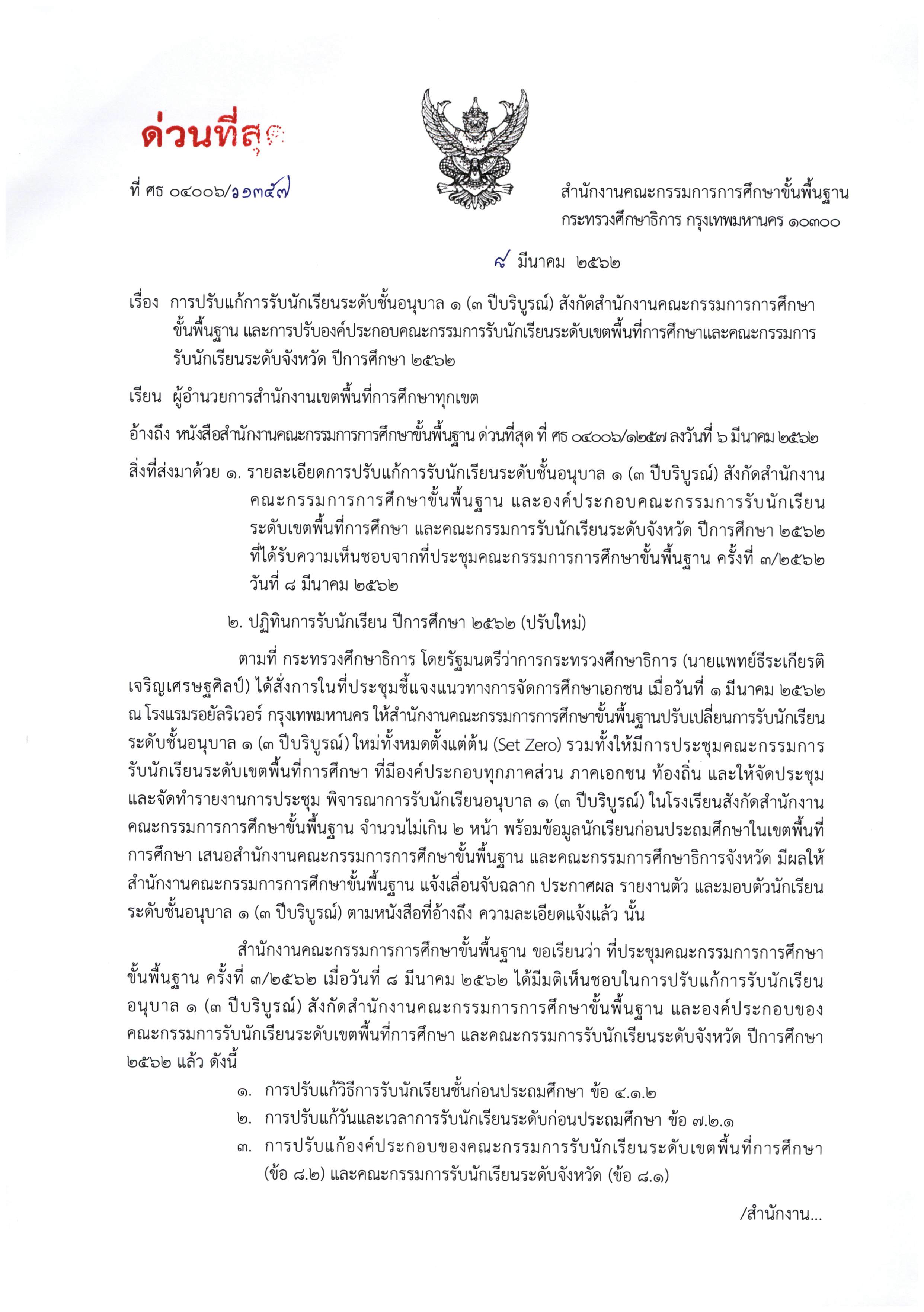 การปรับแก้การรับนักเรียนระดับชั้นอนุบาล 1 (3 ปีบริบูรณ์) สังกัดสำนักงานคณะกรรมการการศึกษาขั้นพื้นฐาน และการปรับองค์ประกอบคณะกรรมการรับนักเรียนระดับเขตพื้นที่การศึกษา และคณะกรรมการนับนักเรียนระดับจังหวัด ปีการศึกษา 2562