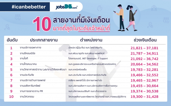 บริษัท จัดหางาน จ๊อบส์ ดีบี (ประเทศไทย) จำกัด ได้จัดทำ รายงานอัตราเงินเดือนของพนักงานไทยประจำปี 2561 โดยรวบรวมข้อมูลจากผู้ประกอบการชั้นนำกว่า 50,000 ราย พบว่า ช่วงเงินเดือนของพนักงานในแต่ละระดับ ไม่ว่าระดับเจ้าหน้าที่ หัวหน้างาน ผู้จัดการ และผู้บริหาร ยังไม่แตกต่างไปจากปีก่อน แต่ที่น่าจับตามองมากที่สุด ได้แก่ สายงานที่มีเงินเดือนมากที่สุดในทุกระดับงาน คือ อีคอมเมิร์ซ บริการด้านการแพทย์ และวิศวกรรม โดยเฉพาะอีคอมเมิร์ซเป็นสายงานเดียวที่ติด Top 5 เงินเดือนสูง โดยระดับเจ้าหน้าที่จะมีเงินเดือนเริ่มต้นเฉลี่ยที่ 21,787 บาท ระดับหัวหน้างานและผู้จัดการมีเงินเดือนเริ่มต้นเฉลี่ย 35,885 บาท และ 55,738 บาท ตามลำดับ ซึ่งเป็นเงินเดือนเริ่มต้นที่สูงที่สุดของระดับงาน ขณะที่ระดับผู้บริหารหากมีประสบการณ์และความเชี่ยวชาญในสายงานอาจได้รับเงินเดือนมากถึง 145,000 บาท