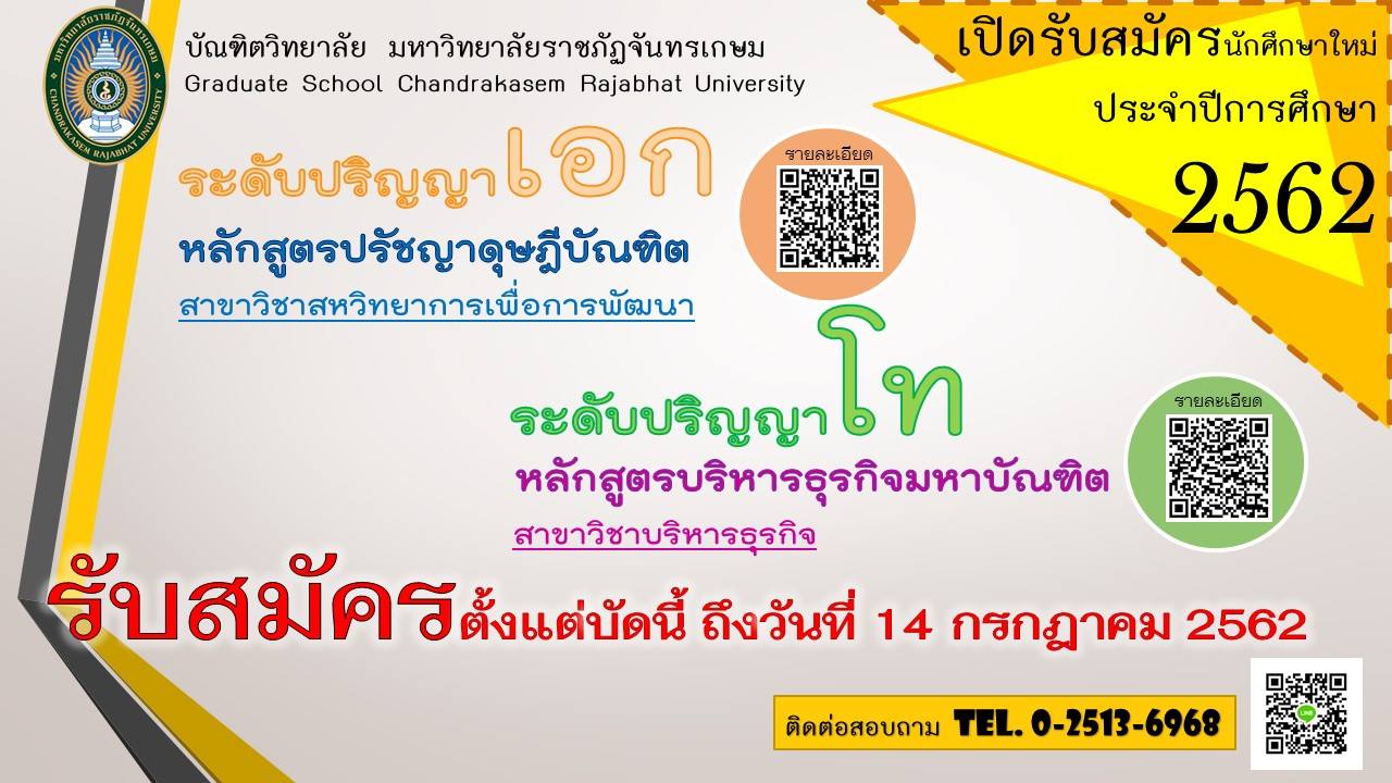 บัณฑิตวิทยาลัย มหาวิทยาลัยราชภัฏจันทรเกษม (มจษ.) เปิดรับสมัครนักศึกษาหลักสูตรประกาศนียบัตรบัณฑิตวิชาชีพครู หลักสูตรบริหารธุรกิจมหาบัณฑิต สาขาสาขาวิชาบริหารธุรกิจ และหลักสูตรปรัชญาดุษฎีบัณฑิต สาขาวิชาสหวิทยาการเพื่อการพัฒนา ประจำปีการศึกษา 2562 สมัครด้วยตนเองตั้งแต่บัดนี้ถึงวันที่ 14 กรกฎาคม 2560 เวลา 09.00-15.30 น. ทุกวันเว้นวันหยุดนักขัตฤกษ์ ณ สำนักงานบัณฑิตวิทยาลัย ชั้น 15 อาคารจันทรา-กาญจนาภิเษก มจษ. สอบถาม โทร. 0 2942 6800 ต่อ 1901,1903 หรือ 0 2513 6968 สามารถดูรายละเอียดและดาวน์โหลดใบสมัครได้ที่เว็บไซต์ http://teacher.chandra.ac.th/bundit