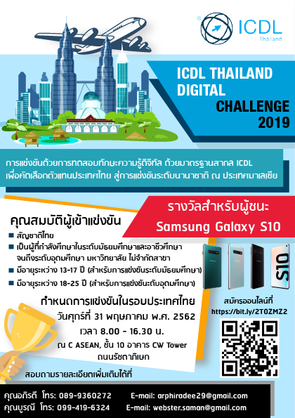 ทาง ICDL จึงขอเรียนเชิญสถาบันการศึกษาได้พิจารณาคัดเลือกตัวแทนนักเรียน/นิสิต/นักศึกษาเข้าร่วมการแข่งขันเพื่อสร้างชื่อเสียงและเป็นเกียรติให้กับสถาบันการศึกษาและประเทศไทย โดยส่งนักเรียน/ นิสิต/ นักศึกษาจำนวน 2 คนจากสถาบัน เพื่อเข้าร่วมโครงการ ภายในวันศุกร์ที่ 19 เมษายน พ.ศ. 2562 เพื่อร่วมเข้าการแข่งขันรอบคัดเลือกระดับประเทศ ICDL Thailand Digital Challenge 2019 (National Round) ที่จะจัดขึ้นในวันพฤหัสบดีที่ 31 พฤษภาคม พ.ศ. 2562 ณ Auditorium, C ASEAN ชั้น 12 อาคาร CW Tower ถนนรัชดาภิเษก เวลา 8.30 น. - 16.30 น.