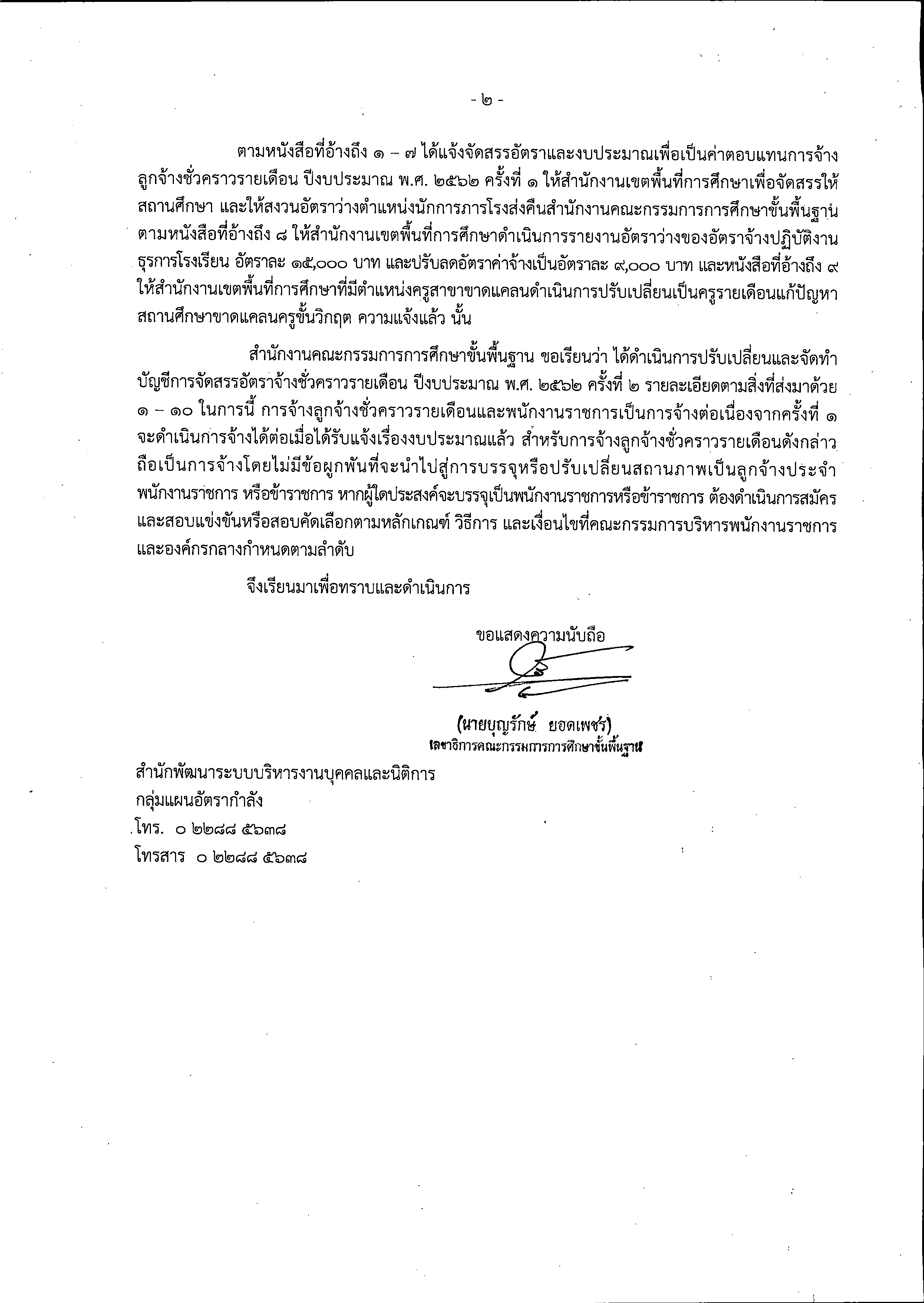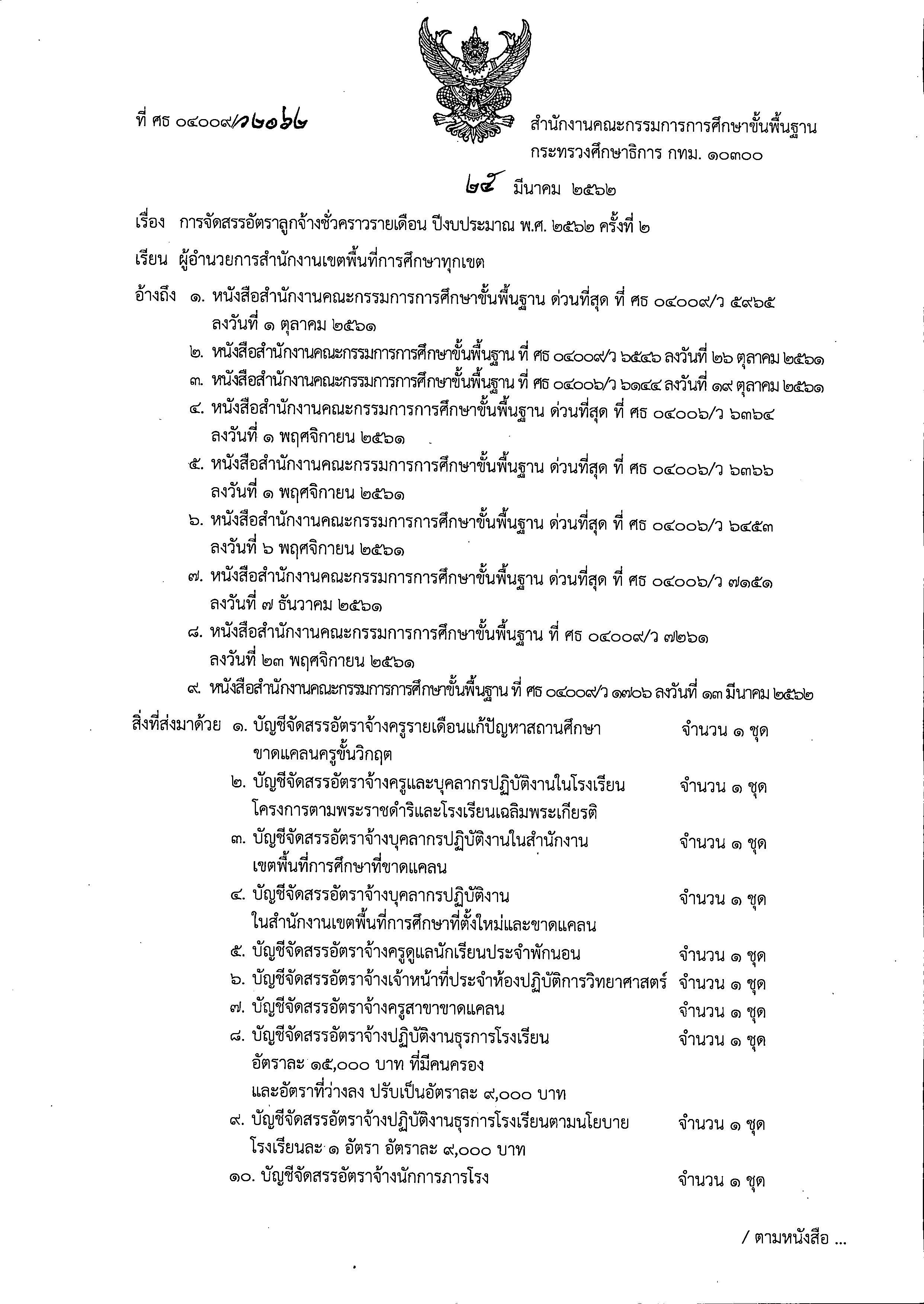 ที่ ศธ 04009/ว2062 เรื่อง การจัดสรรอัตราลูกจ้างชั่วคราวรายเดือน ปีงบประมาณ พ.ศ. 2562 ครั้งที่ 2