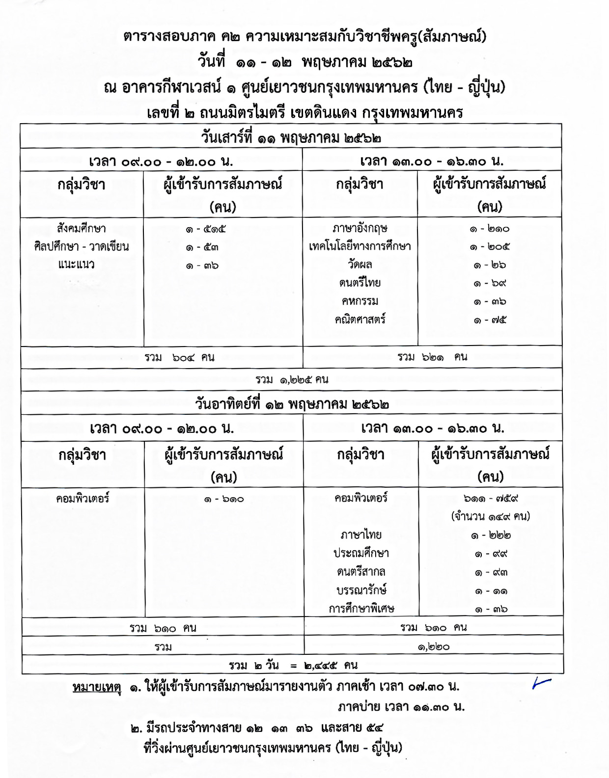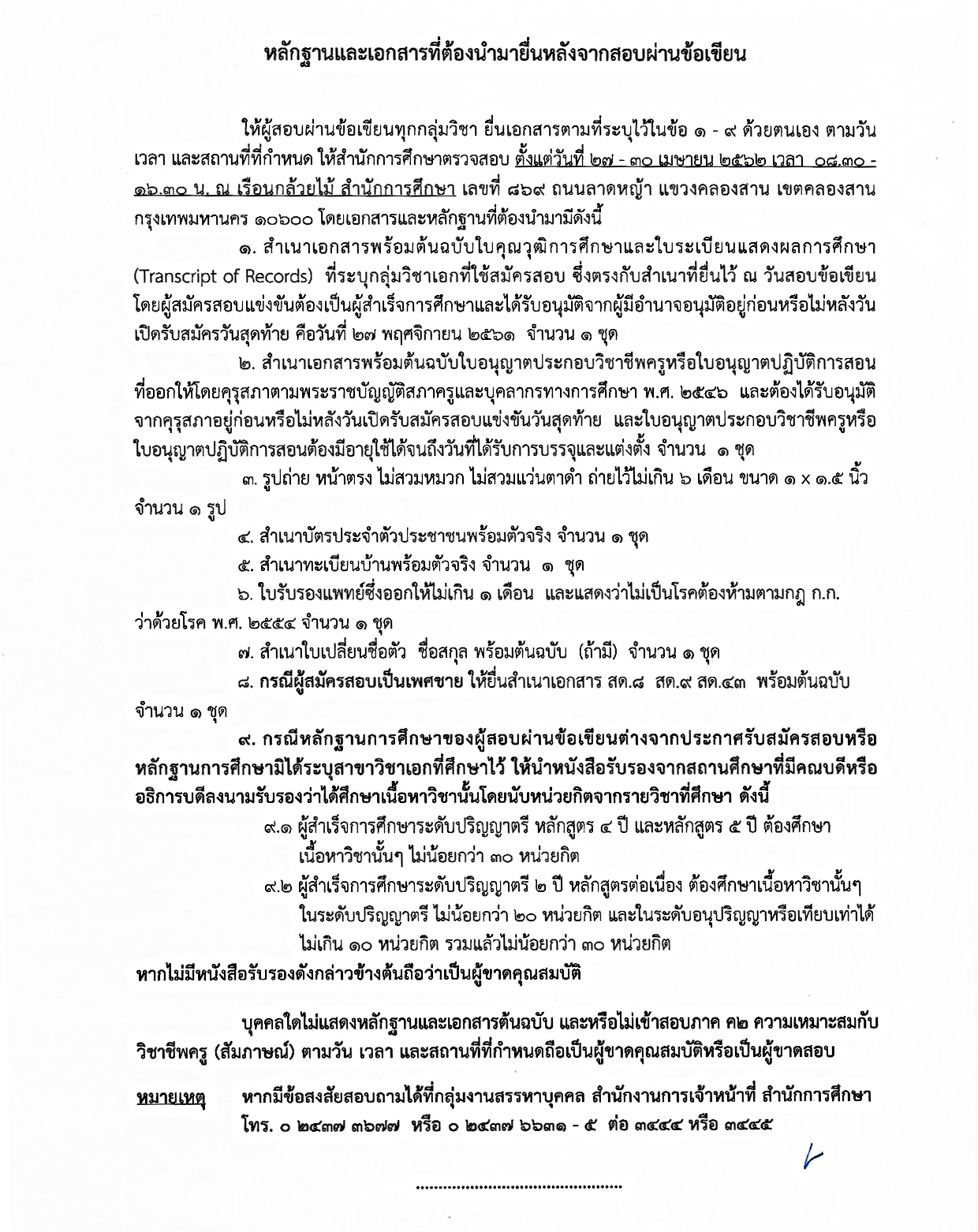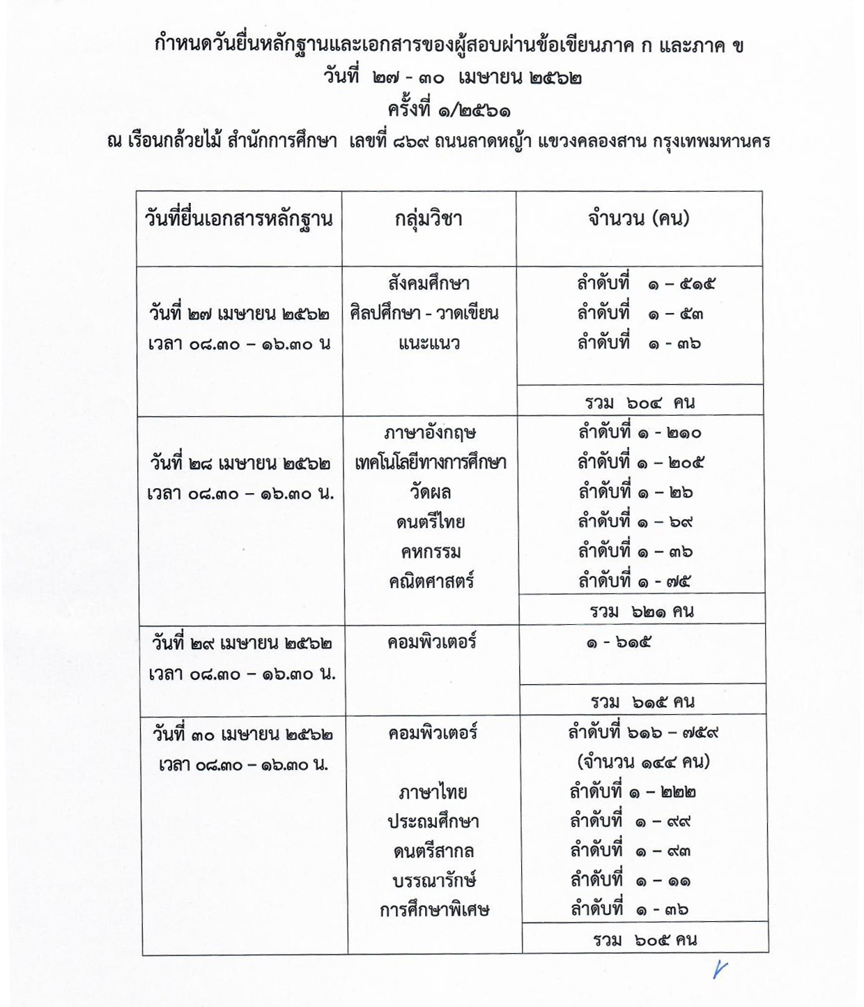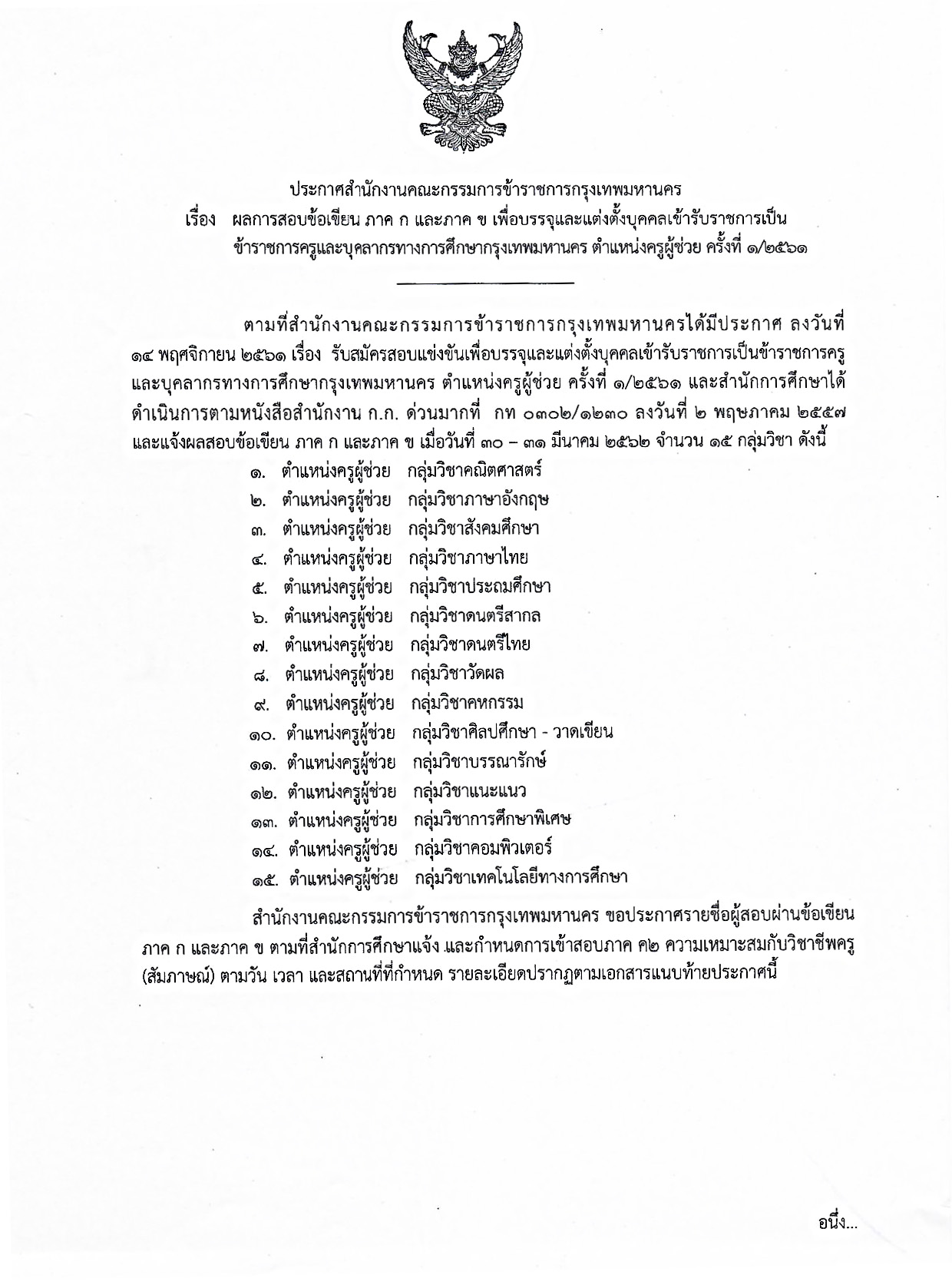 ตามที่สำนักงานคณะกรรมการช้าราชการกรุงเทพมหานครได้มีประกาศ ลงวันที่ 14 พฤศจิกายน 2561 เรื่อง รับสมัครสอบแข่งขันเพื่อบรรจุและแต่งตั้งบุคคลเข้ารับราชการเป็นข้าราชการครูและบุคลากรทางการศึกษากรุงเทพมหานคร ตำแหน่งครูผู้ช่วย ครั้งที่ 1/2561 และสำนักการศึกษาได้ดำเนินการตามหนังสือสำนักงาน ก.ก. ด่วนมากที่ กท 0306/1230 ลงวันที่ 2 พฤษภาคม 2557 และแจ้งผลสอบข้อเขียน ภาค ก และภาค ข เมื่อวันที่ 30 - 31 มีนาคม 2562 จำนวน 15 กลุ่มวิชา ดังนี้