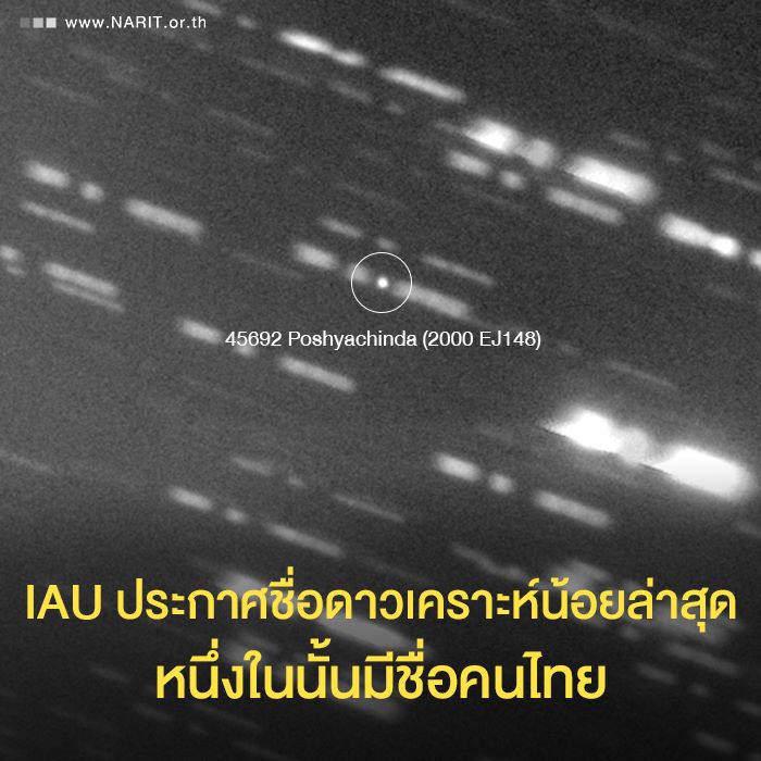 “เมื่อวันที่ 6 เม.ย.62 ที่ผ่านมา สหพันธ์ดาราศาสตร์นานาชาติ หรือ IAU ประกาศชื่อดาวเคราะห์น้อยล่าสุดจำนวน 106 ดวง หนึ่งในจำนวนนี้ ชื่อของ ดร.ศรัณย์ โปษยะจินดา ผู้อำนวยการสถาบันวิจัยดาราศาสตร์แห่งชาติ ได้รับการเสนอให้เป็นชื่อของดาวเคราะห์น้อย 2000 EJ148 ค้นพบโดยหอดูดาวแคทาลินาสกายเซอร์เวย์ สหรัฐอเมริกา ปัจจุบันมีดาวเคราะห์น้อยชื่อคนไทยรวมทั้งสิ้น 11 ดวง