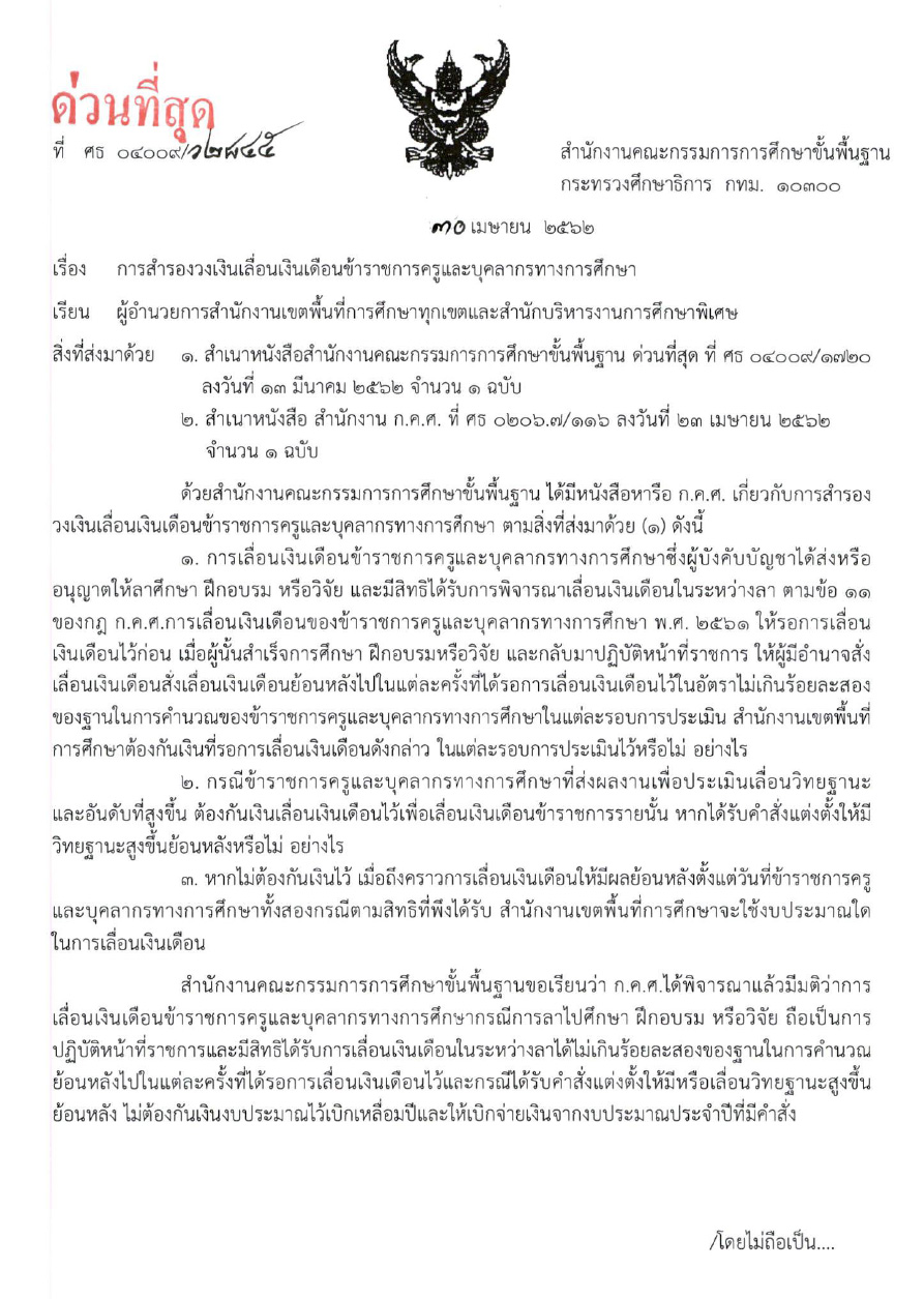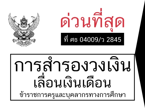 สำนักงานคณะกรรมการการศึกษาขั้นพื้นฐาน มีหนังสือ ด่วนที่สุด ที่ ศธ 04009/ว 2845 การสำรองวงเงินเลื่อนเงินเดือนข้าราชการครูและบุคลากรทางการศึกษา