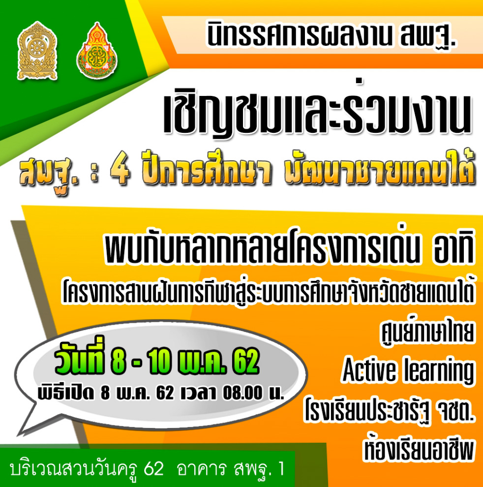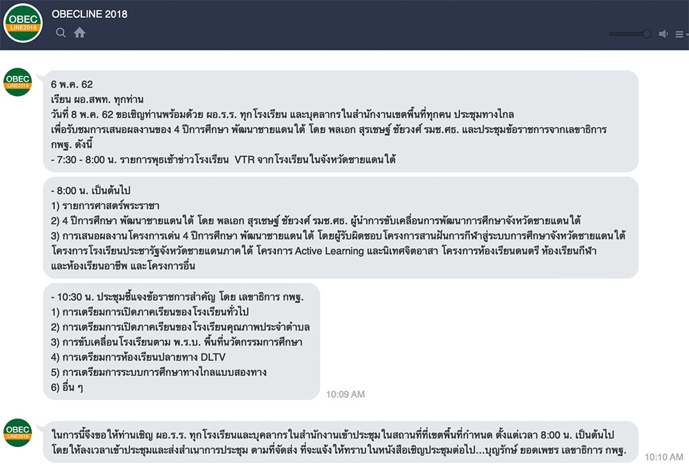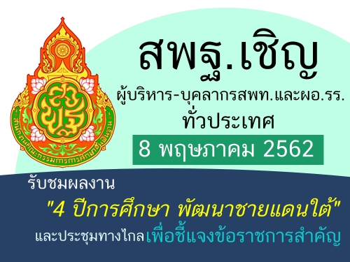 เมื่อวันที่ 6 พ.ค.2562 ดร.บุญรักษ์ ยอดเพชร เลขาธิการคณะกรรมการการศึกษาขั้นพื้นฐาน ได้เชิญชวน ผู้บริหารสำนักงานเขตพื้นที่การศึกษา ผู้อำนวยการโรงเรียนทุกโรงเรียน และบุคลากรในสำนักงานเขตพื้นที่ทุกคน ประชุมทางไกล เพื่อรับชมการเสนอผลงานของ 4 ปีการศึกษา พัฒนาชายแดนใต้ โดย พลเอก สุรเชษฐ์ ชัยวงศ์ รมช.ศธ. และประชุมข้อราชการจากเลขาธิการ กพฐ. โดยมีกำหนดการ ดังนี้