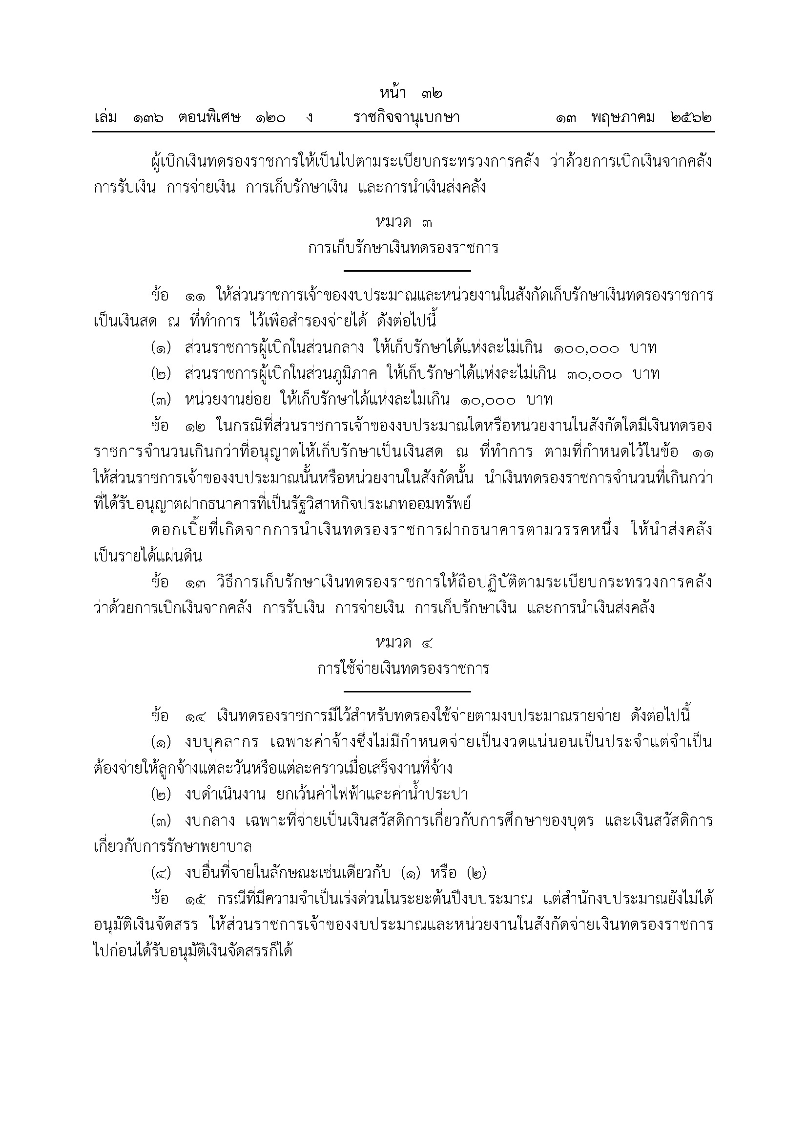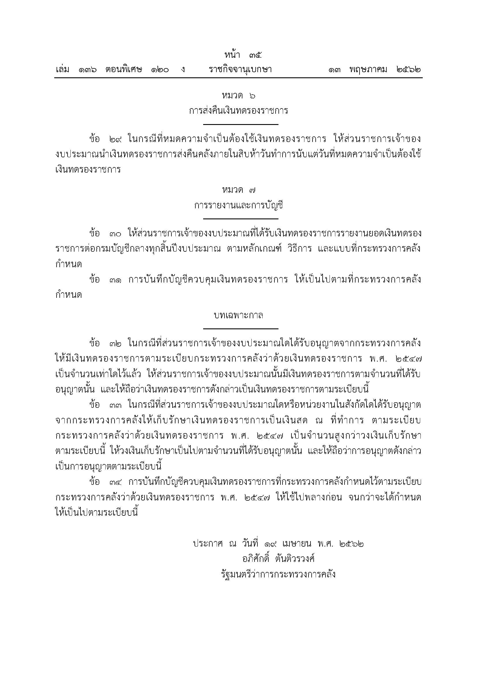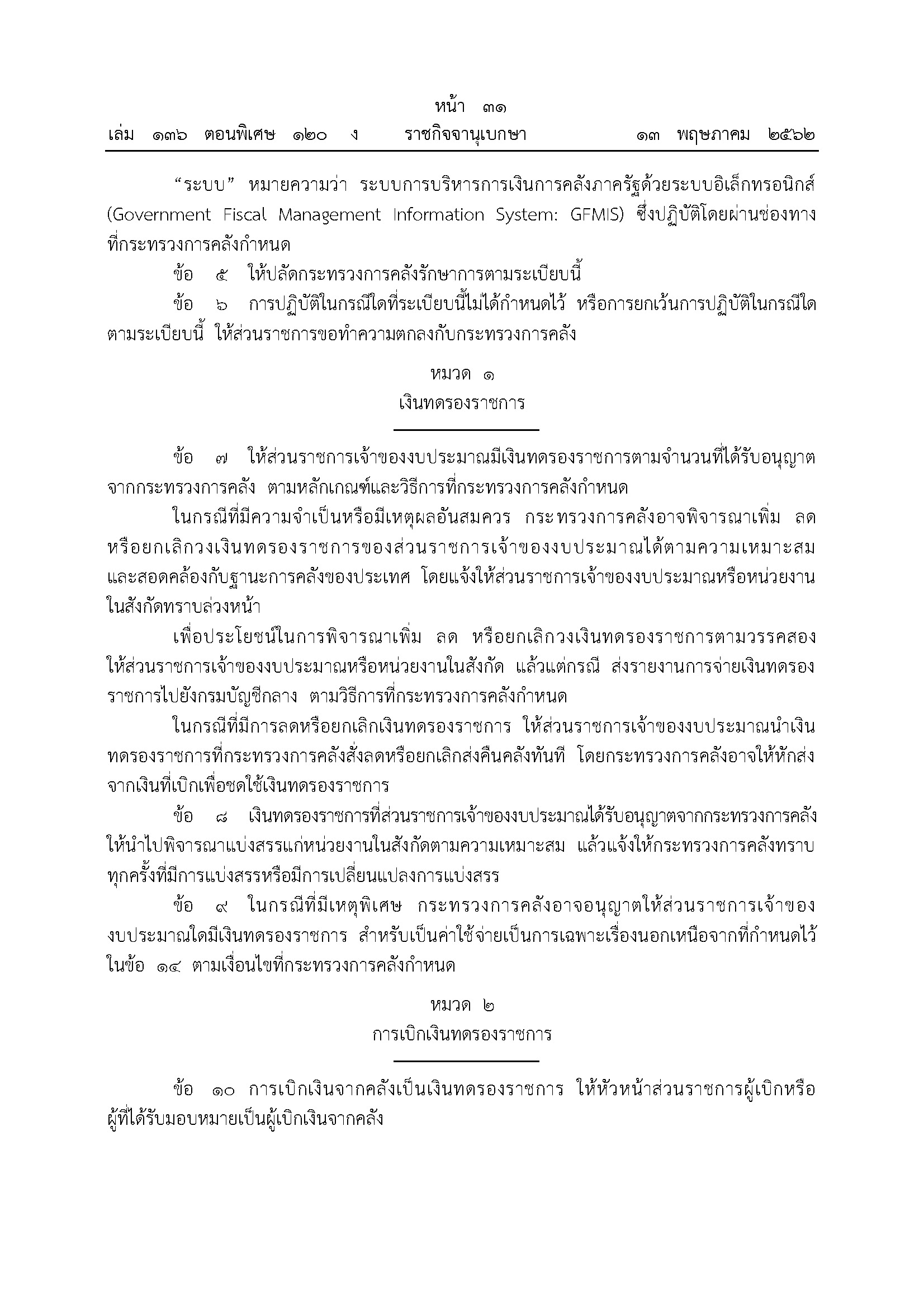 เมื่อวันที่ 13 พฤษภาคม 2562 เว็บไซต์ราชกิจจานุเบกษา ได้เผยแพร่ ระเบียบกระทรวงการคลัง ว่าด้วยเงินทดรองราชการ พ.ศ. 2562 มีรายละเอียด ดังนี้