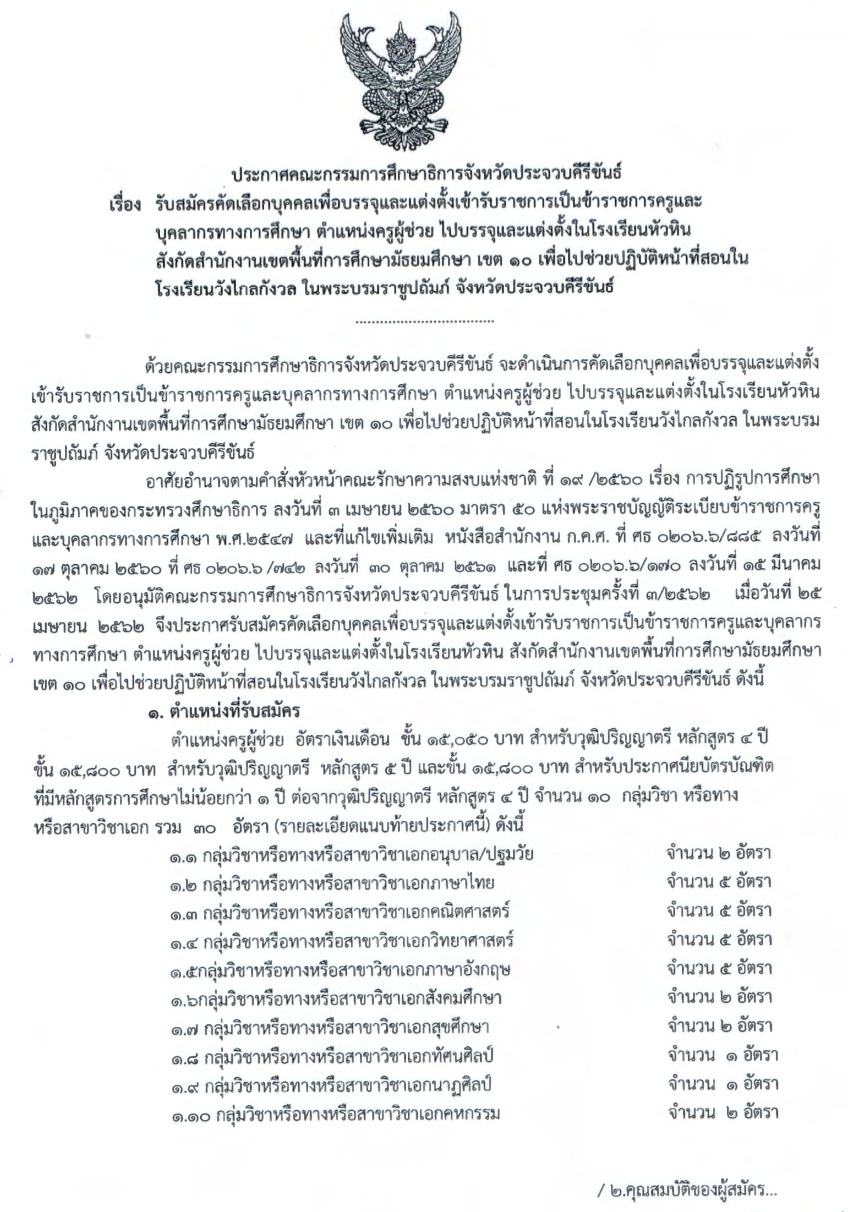 กศจ.ประจวบคีรีขันธ์ รับสมัครคัดเลือกบุคคลเพื่อบรรจุและแต่งตั้งเข้ารับราชการเป็นข้าราชการครู และบุคลากรทางการศึกษา ตำแหน่งครูผู้ช่วย ไปบรรจุและแต่งตั้งในโรงเรียนหัวหิน สังกัดสำนักงานเขตพื้นที่การศึกษามัธยมศึกษา เขต 10 เพื่อไปช่วยปฏิบัติหน้าที่สอนในโรงเรียนวังไกลกังวล ในพระบรมราชูปถัมภ์ จังหวัดประจวบคีรีขันธ์