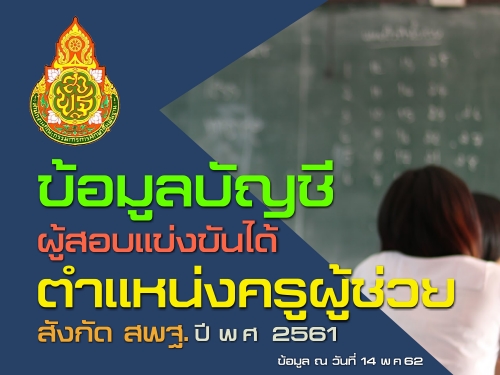 บัญชีผู้สอบแข่งขันได้ ตำแหน่งครูผู้ช่วย สังกัดสำนักงานคณะกรรมการการศึกษาขั้นพื้นฐาน ปี พ.ศ. 2561 ข้อมูล ณ วันที่ 14 พฤษภาคม 2562