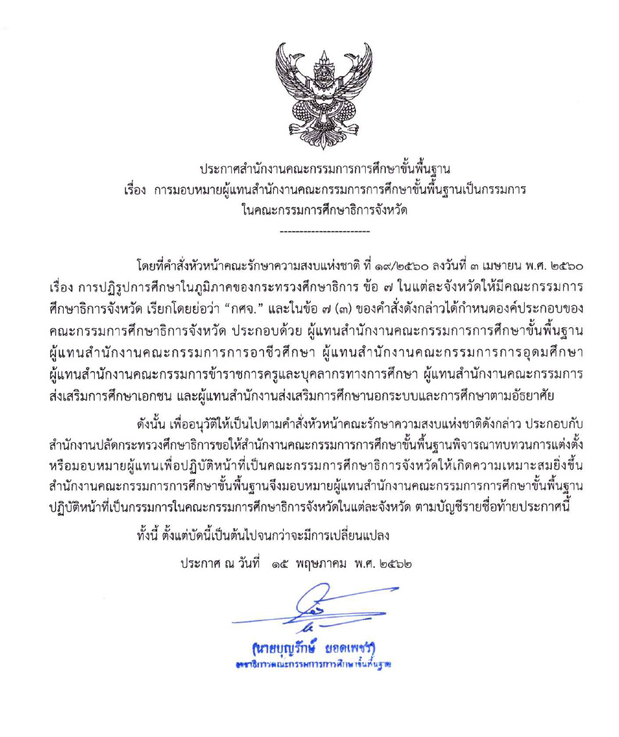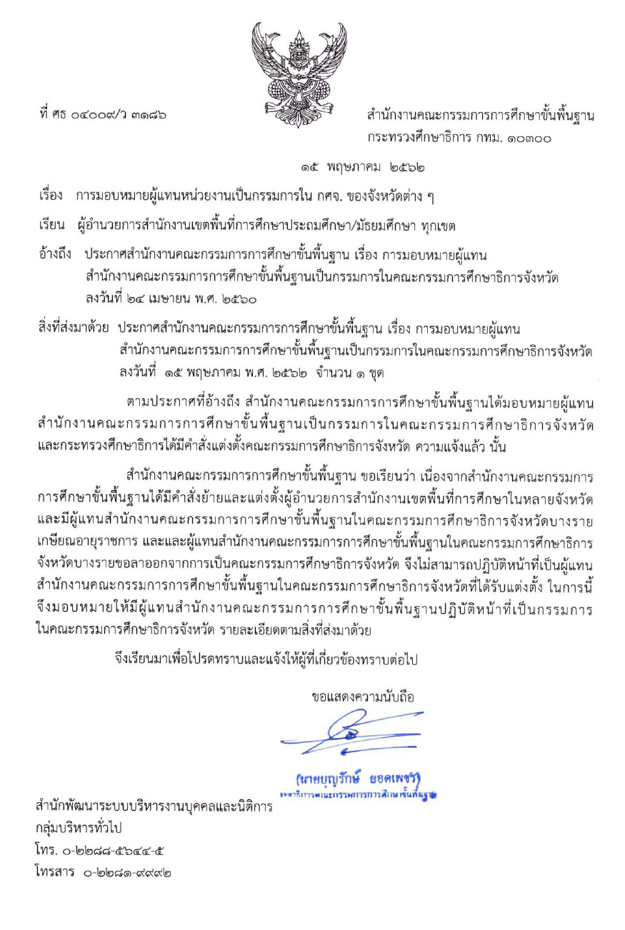 ที่ ศธ 04009/ ว 3186 เรื่อง การมอบหมายผู้แทนหน่วยงานเป็นกรรมการใน กศจ. ของจังหวัดต่าง ๆ