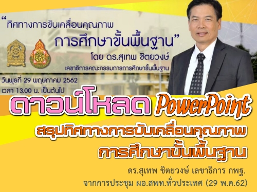Powerpoint “สรุปทิศทางการขับเคลื่อนคุณภาพ การศึกษาขั้นพื้นฐาน” การประชุมสัมมนาผู้อำนวยการสำนักงานเขตพื้นที่การศึกษาทั่วประเทศ ครั้งที่ 1/2562