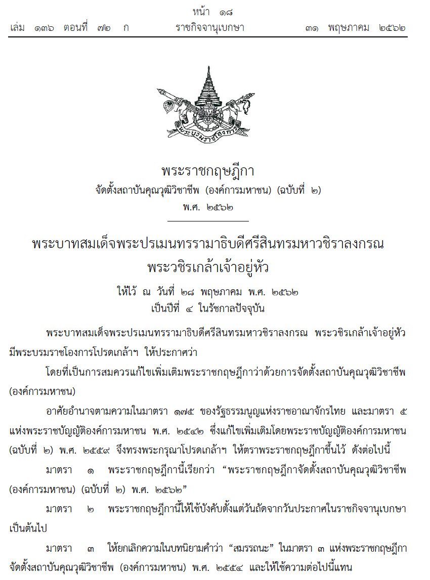 เมื่อวันที่ 31 พฤษภาคม 2562 เว็บไซต์ราชกิจจานุเบกษา ได้เผยแพร่ พระราชกฤษฎีกาจัดตั้งสถาบันคุณวุฒิวิชาชีพ (องค์การมหาชน) (ฉบับที่ 2) พ.ศ. 2562