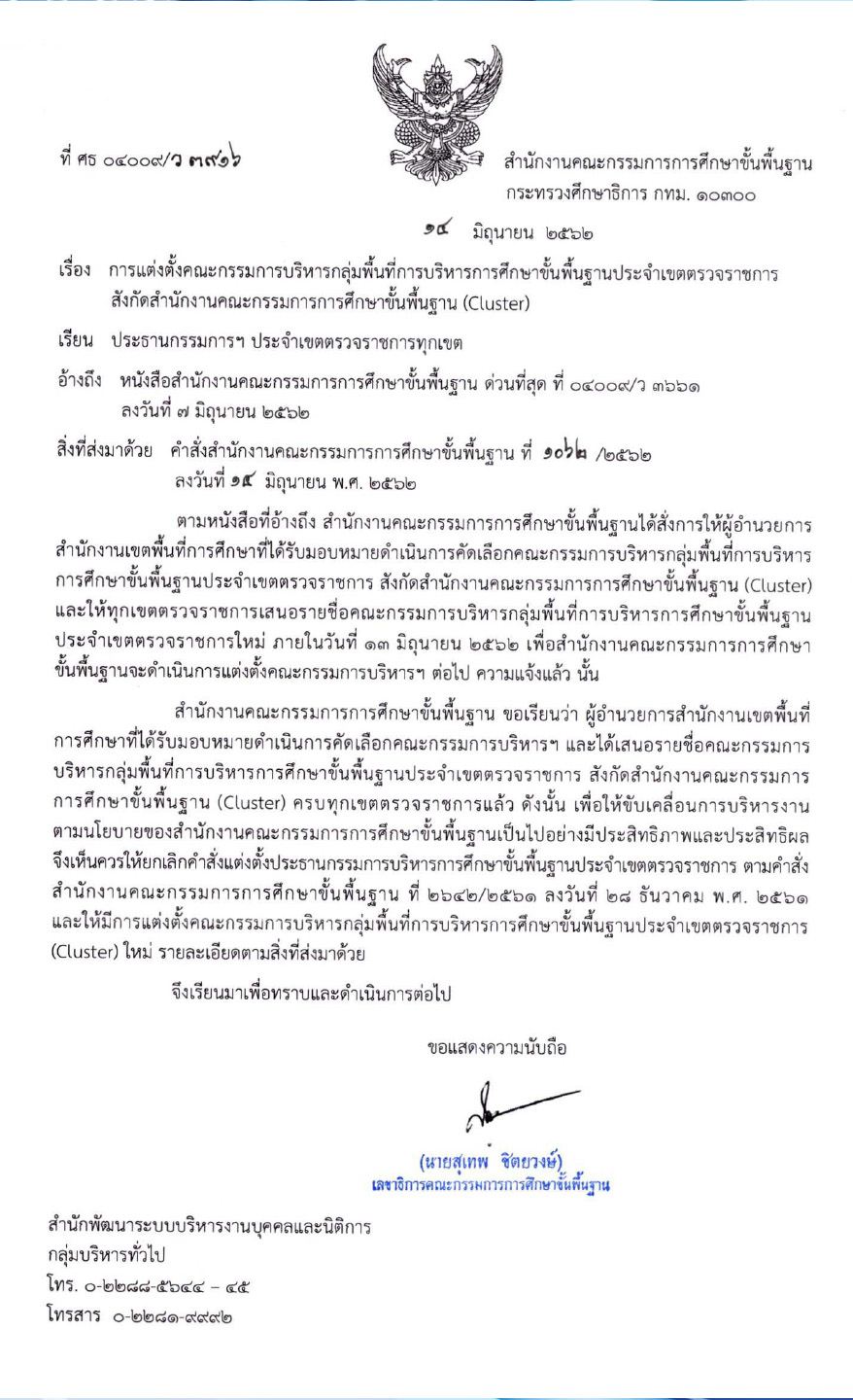 ที่ ศธ 04009/ว3916 การแต่งตั้งคณะกรรมการบริหารกลุ่มพื้นที่การบริหารการศึกษาขั้นพื้นฐานประจำเขตตรวจราชการสังกัด สพฐ.(Cluster)