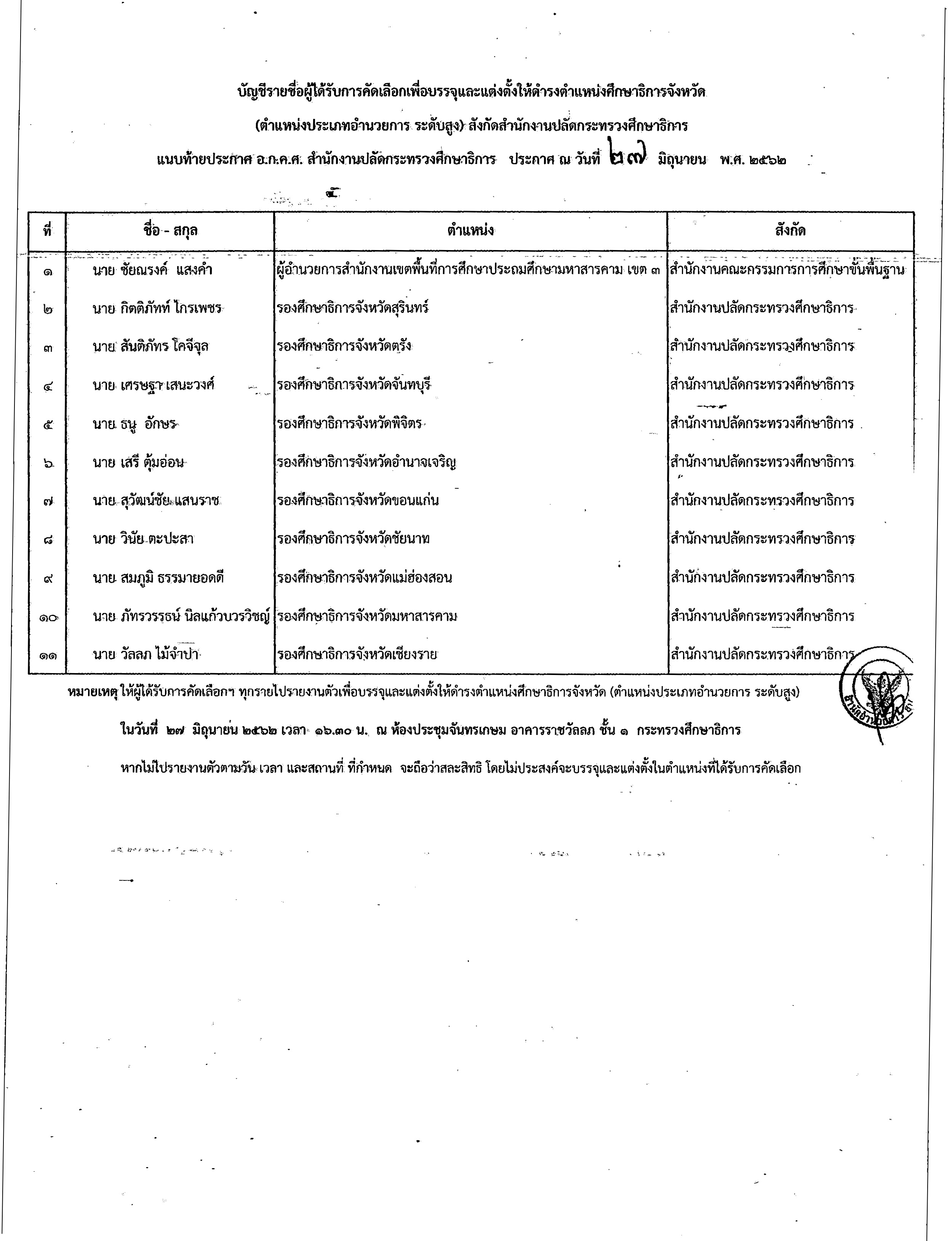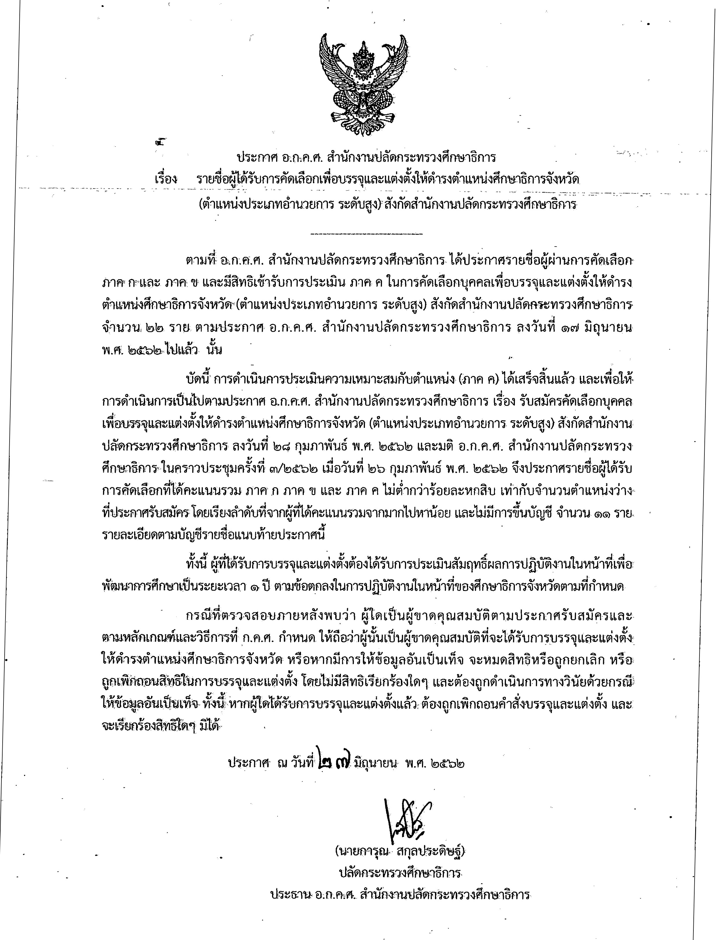 ประกาศรายชื่อผู้ได้รับการคัดเลือกเพื่อบรรจุและแต่งตั้งให้ดำรงตำแหน่งศึกษาธิการจังหวัด