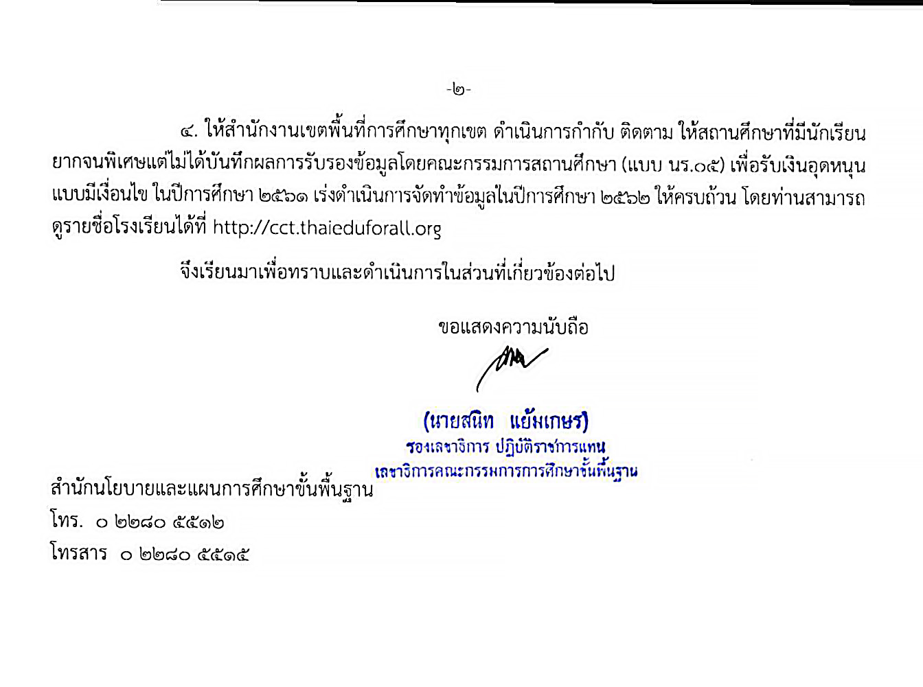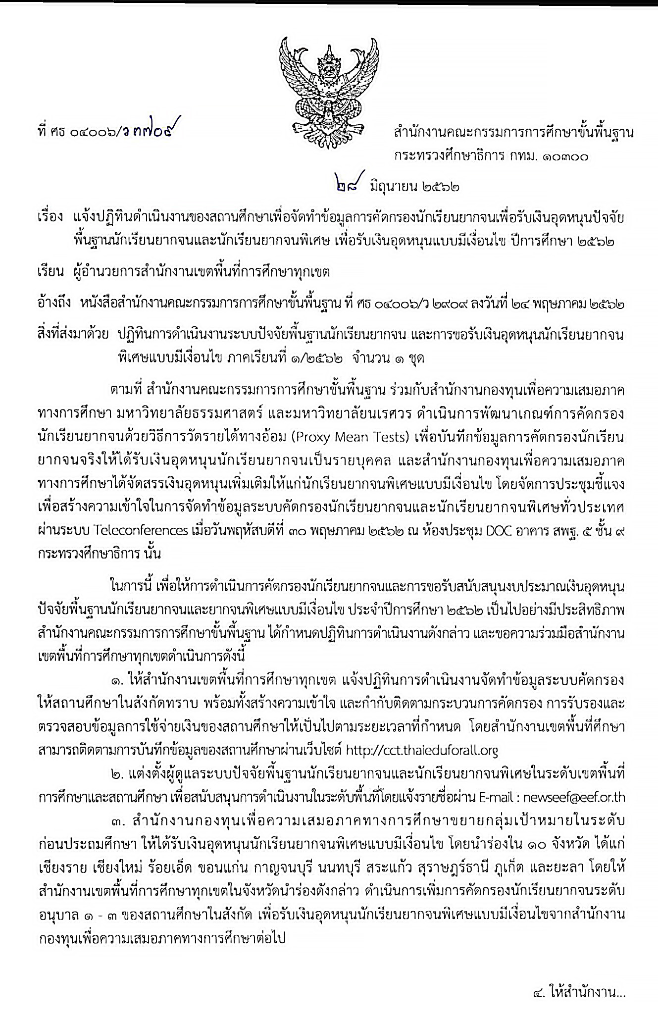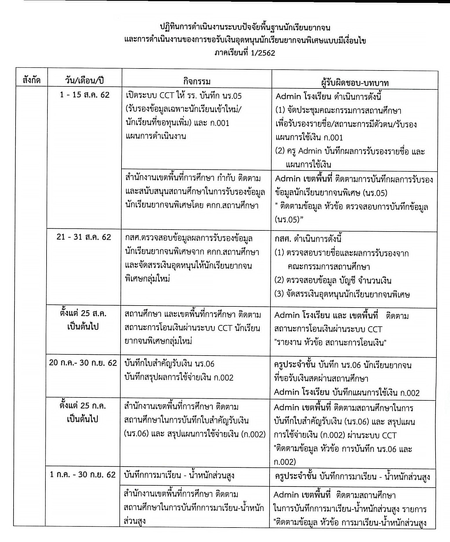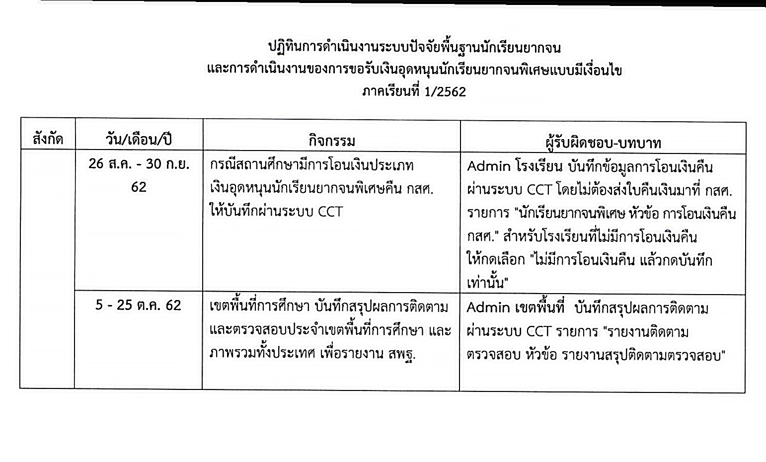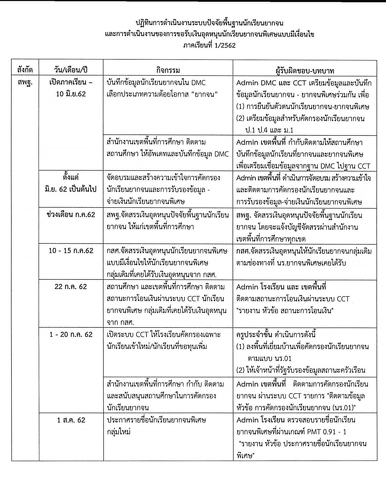 สำนักงานคณะกรรมการการศึกษาขั้นพื้นฐานแจ้งปฏิทินดำเนินงานของสถานศึกษาเพื่อจัดทำข้อมูลการคัดกรองนักเรียนยากจนเพื่อรับเงินอุดหนุนปัจจัยพื้นฐานนักเรียนยากจนและนักเรียนยากจนพิเศษ เพื่อรับเงินอุดหนุนแบบมีเงื่อนไข ปีการศึกษา 2562