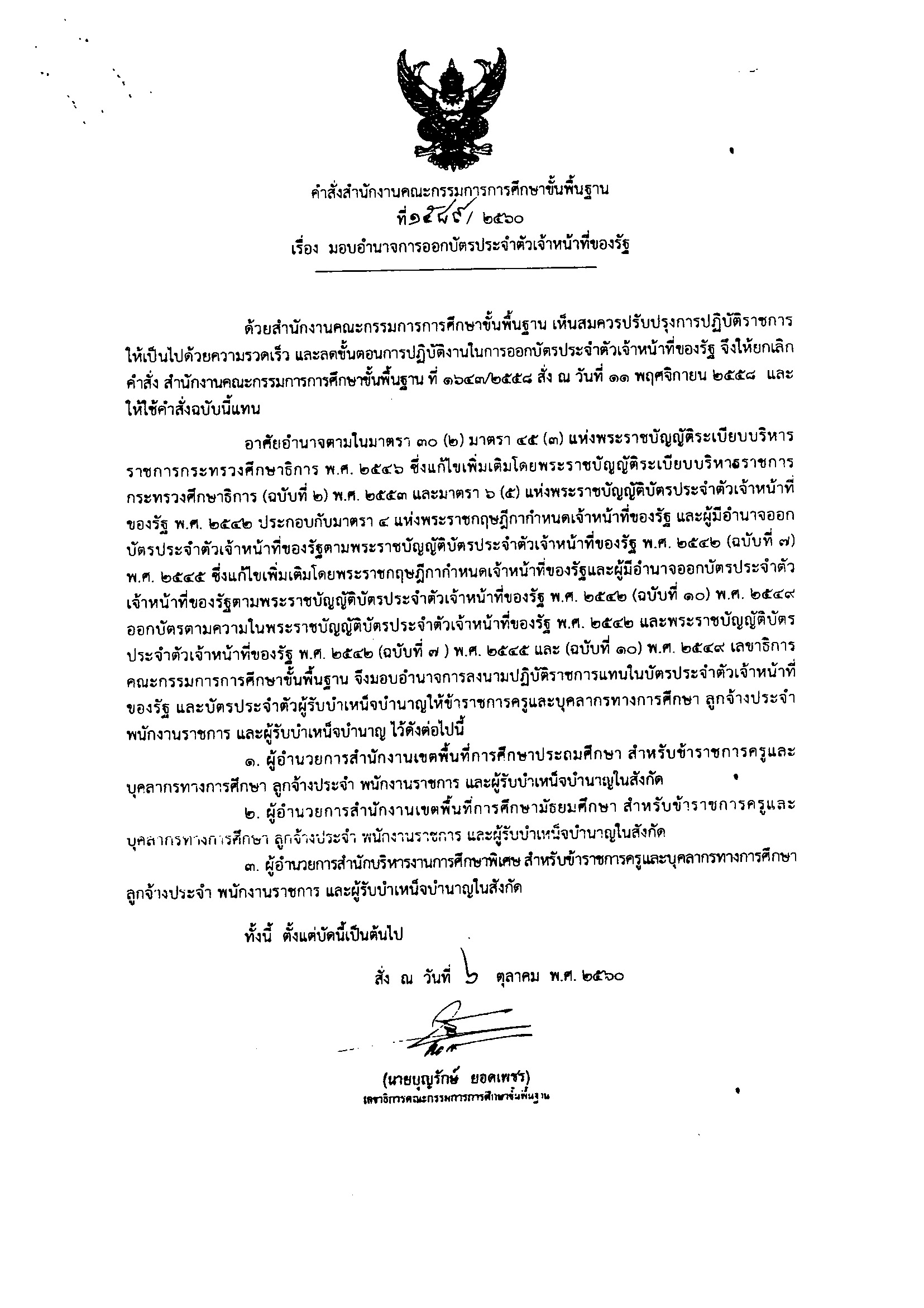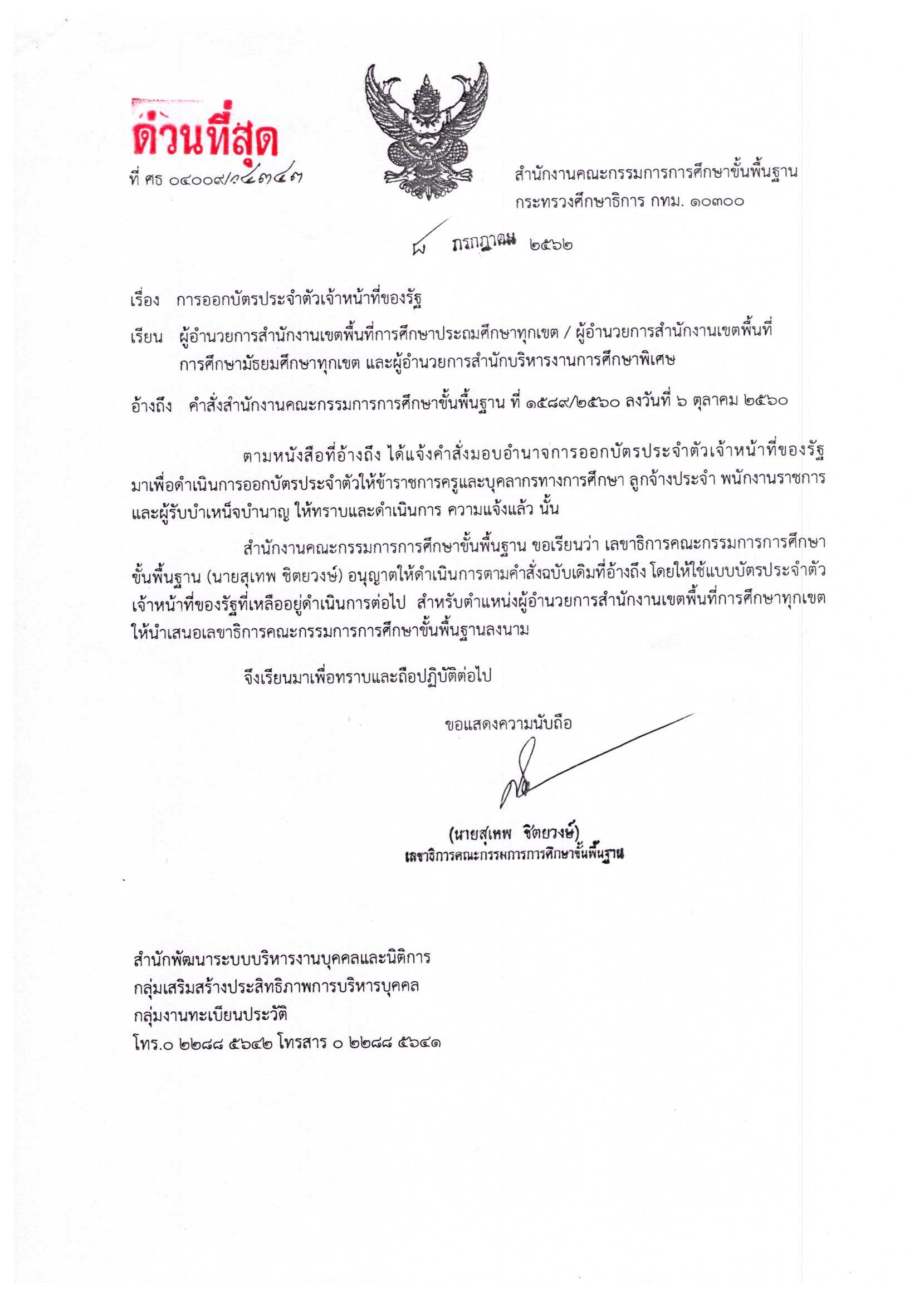 ด่วนที่สุด ที่ ศธ04009/ว4343 การออกบัตรประจำตัวเจ้าหน้าที่ของรัฐ