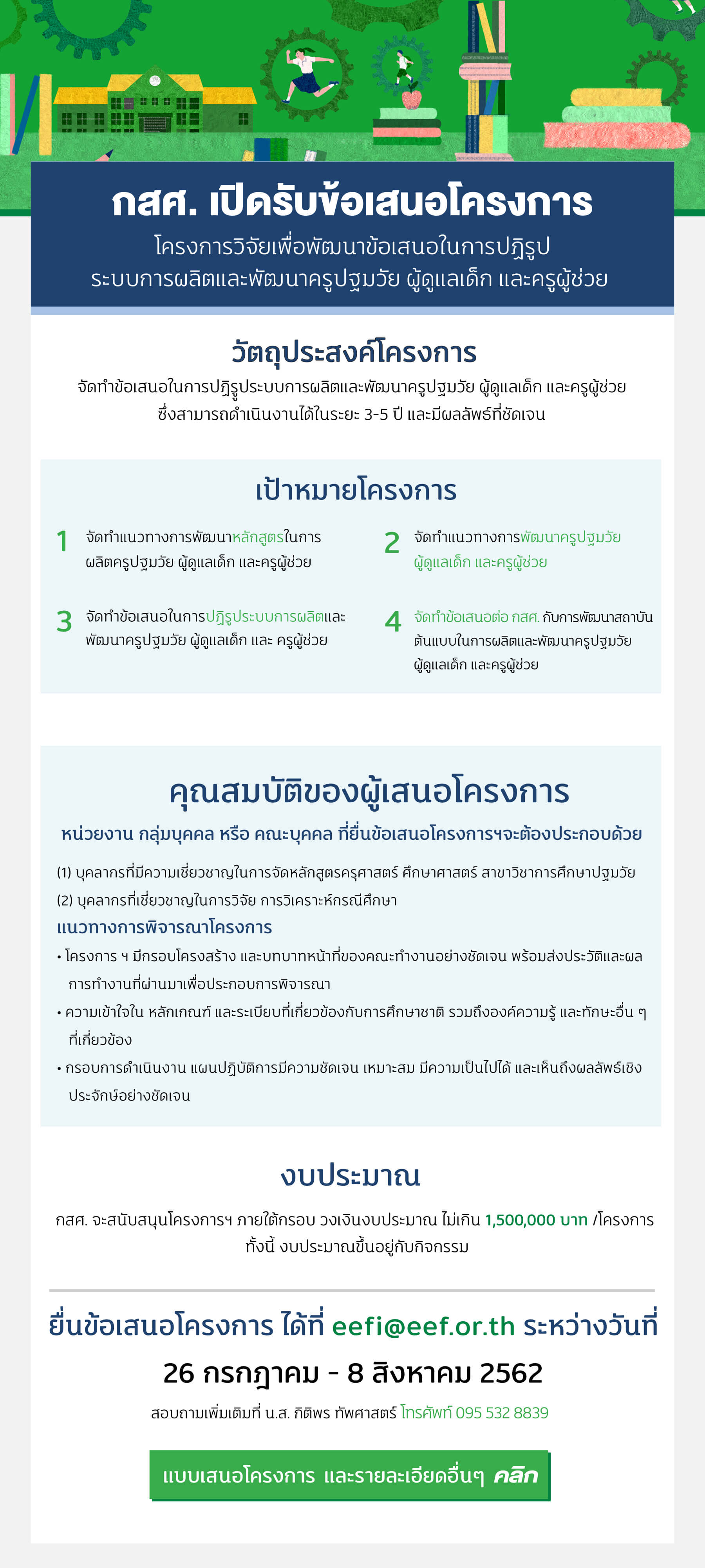 กองทุนเพื่อความเสมอภาคทางการศึกษา (กสศ.) ประกาศเปิดรับข้อเสนอโครงการวิจัยเพื่อพัฒนาข้อเสนอในการปฏิรูประบบการผลิตและพัฒนาครูปฐมวัย ผู้ดูแลเด็ก และครูผู้ช่วย ระหว่างวันที่ 26 ก.ค.- 8 ส.ค. 2562 นี้
