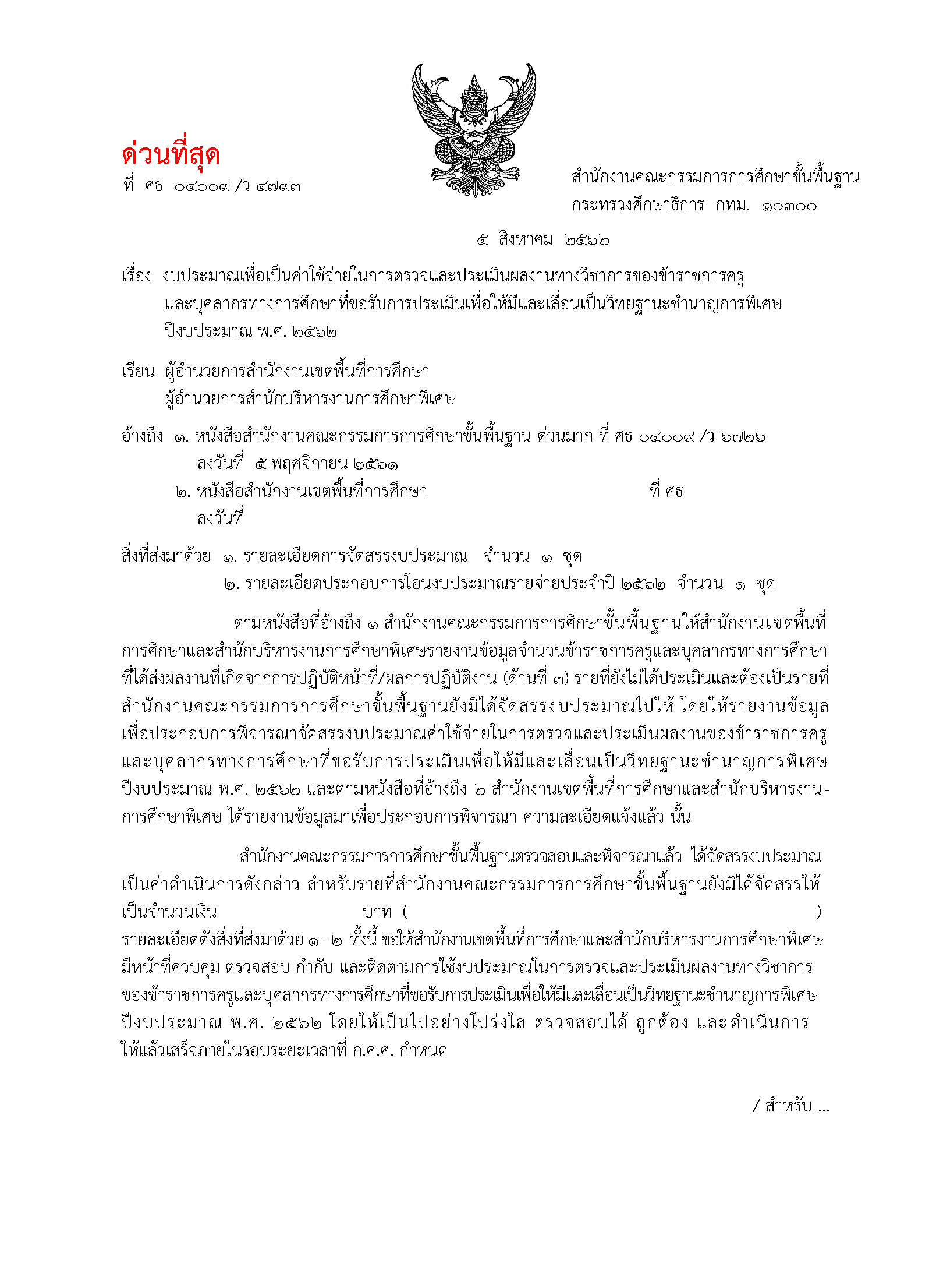 ด่วนที่สุด ที่ ศธ 04009/ว 4793 เรื่อง งบประมาณเพื่อเป็นค่าใช้จ่ายในการตรวจและประเมินผลงานทางวิชาการของข้าราชการครูและบุคลากรทางการศึกษาที่ขอรับการประเมินเพื่อให้มีและเลื่อนเป็นวิทยฐานะชำนาญการพิเศษ ปีงบประมาณ พ.ศ. 2562
