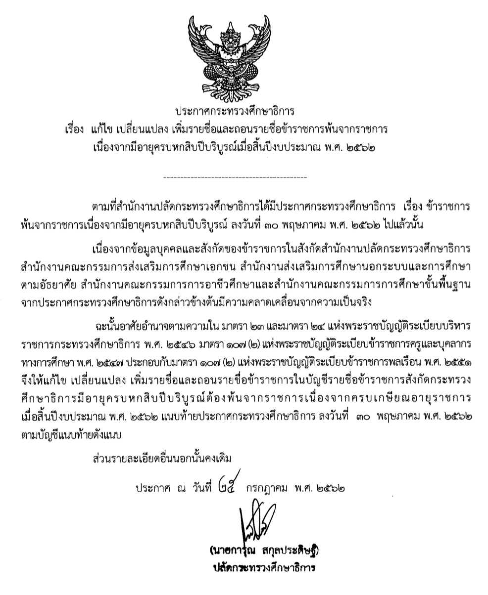 ประกาศ แก้ไขเปลี่ยนแปลง เพิ่มรายชื่อและถอนรายชื่อข้าราชการพ้นจากราชการเนื่องจากมีอายุครบ60ปีบริบูรณ์เมื่อสิ้นปีงบประมาณ พ.ศ.2562