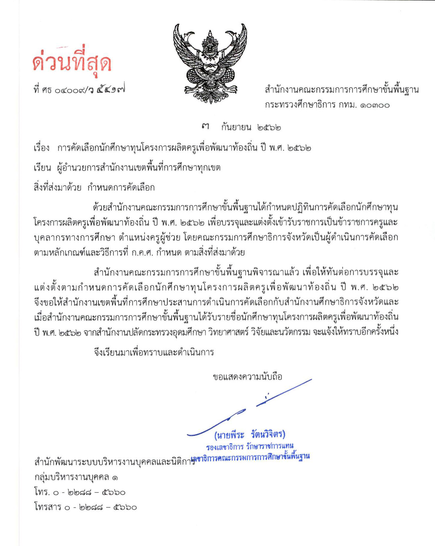 ด่วนที่สุด ที่ ศธ 04009/ว 5417 การคัดเลือกนักศึกษาทุนโครงการผลิตครูเพื่อพัฒนาท้องถิ่น ปี พ.ศ.2562