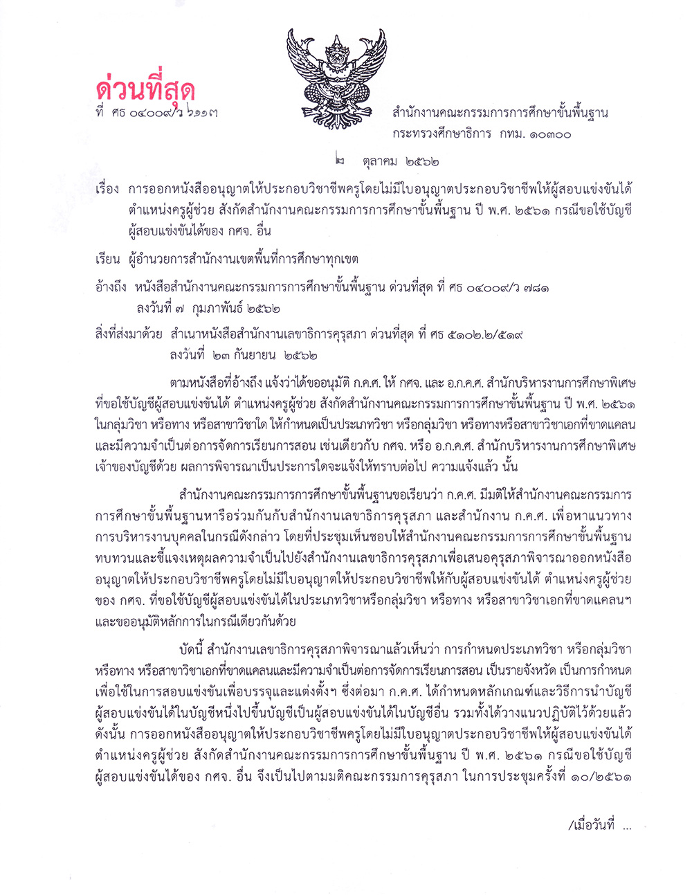 ด่วนที่สุด การออกหนังสืออนุญาตให้ประกอบวิชาชีพครูโดยไม่มีใบอนุญาตประกอบวิชาชีพให้ผู้สอบแข่งขันได้ตำแหน่งครูผู้ช่วย สังกัด สพฐ. ปี พ.ศ.2561 กรณีขอใช้บัญชีผู้สอบแข่งขันได้ของ กศจ.อื่น