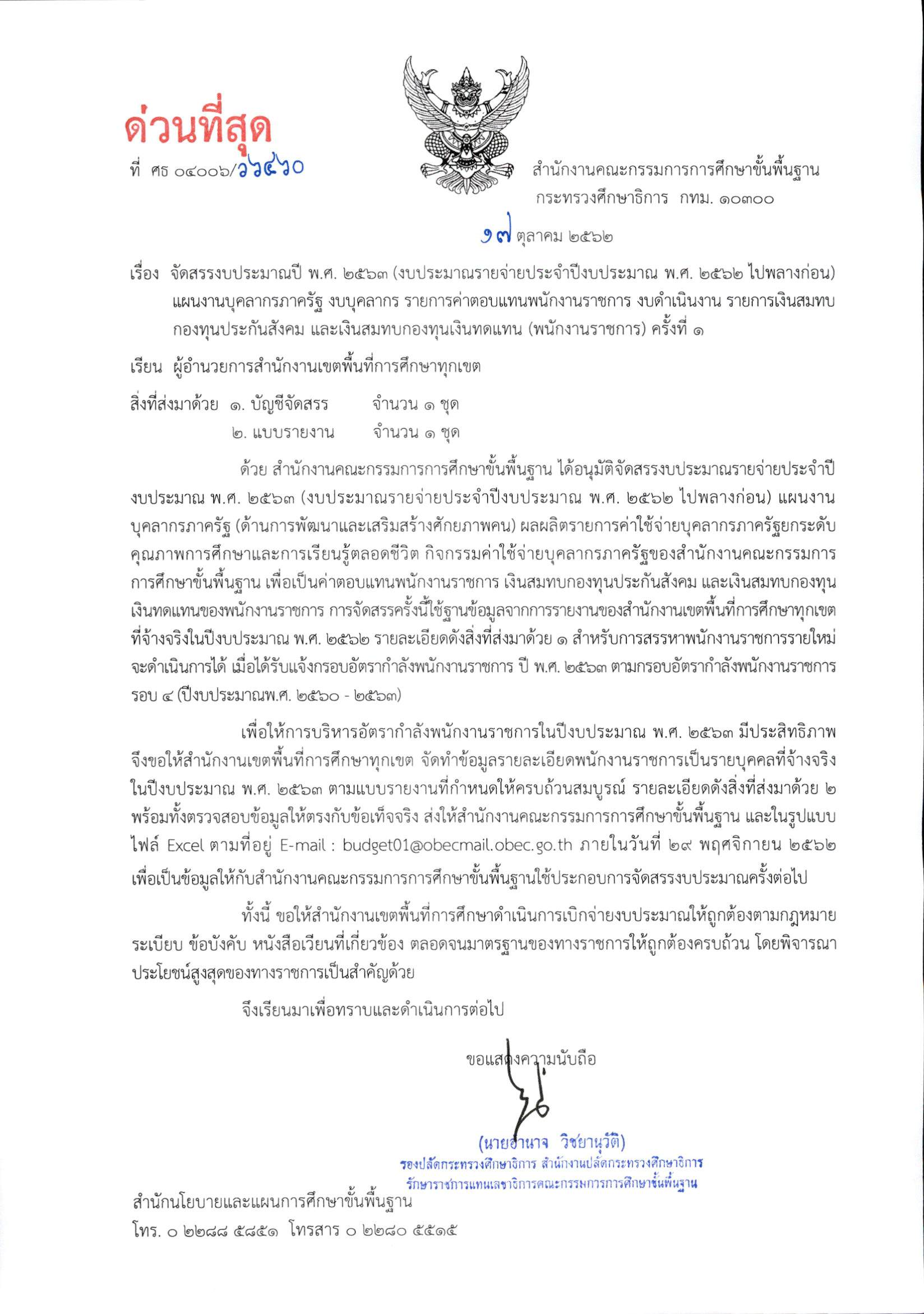 สพฐ.จัดสรรงบประมาณปี พ.ศ. 2563 (งบประมาณรายจ่ายประจำปีงบประมาณ พ.ศ. 2562 ไปพลางก่อน) แผนงานบุคลากรภาครัฐ งบบุคลากร รายการค่าตอบแทนพนักงานราชการ งบดำเนินงาน รายการเงินสมทบกองทุนประกันสังคม และเงินสมทบกองทุนเงินทดแทน (พนักงานราชการ) ครั้งที่ 1