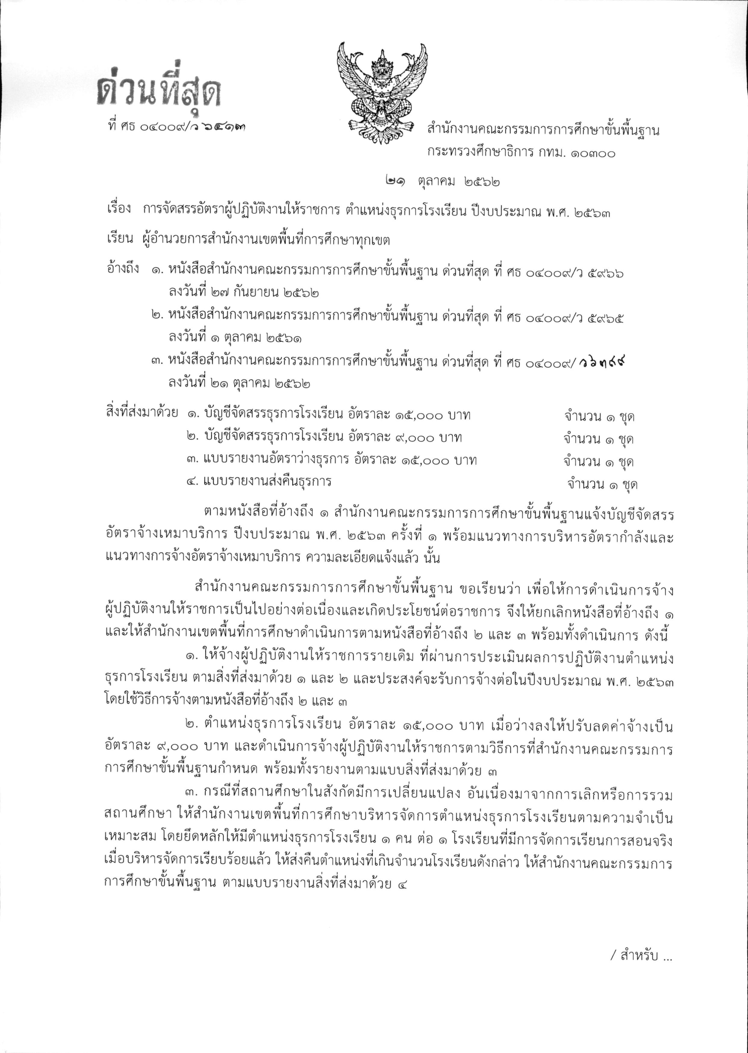 สำนักงานคณะกรรมการการศึกษาขั้นพื้นฐาน มีหนังสือ ด่วนที่สุด เรื่อง การจัดสรรอัตราให้ผู้ปฏิบัติงานให้ราชการ ตำแหน่งธุรการโรงเรียน ปีงบประมาณ พ.ศ. 2563 รายละเอียด ดังนี้