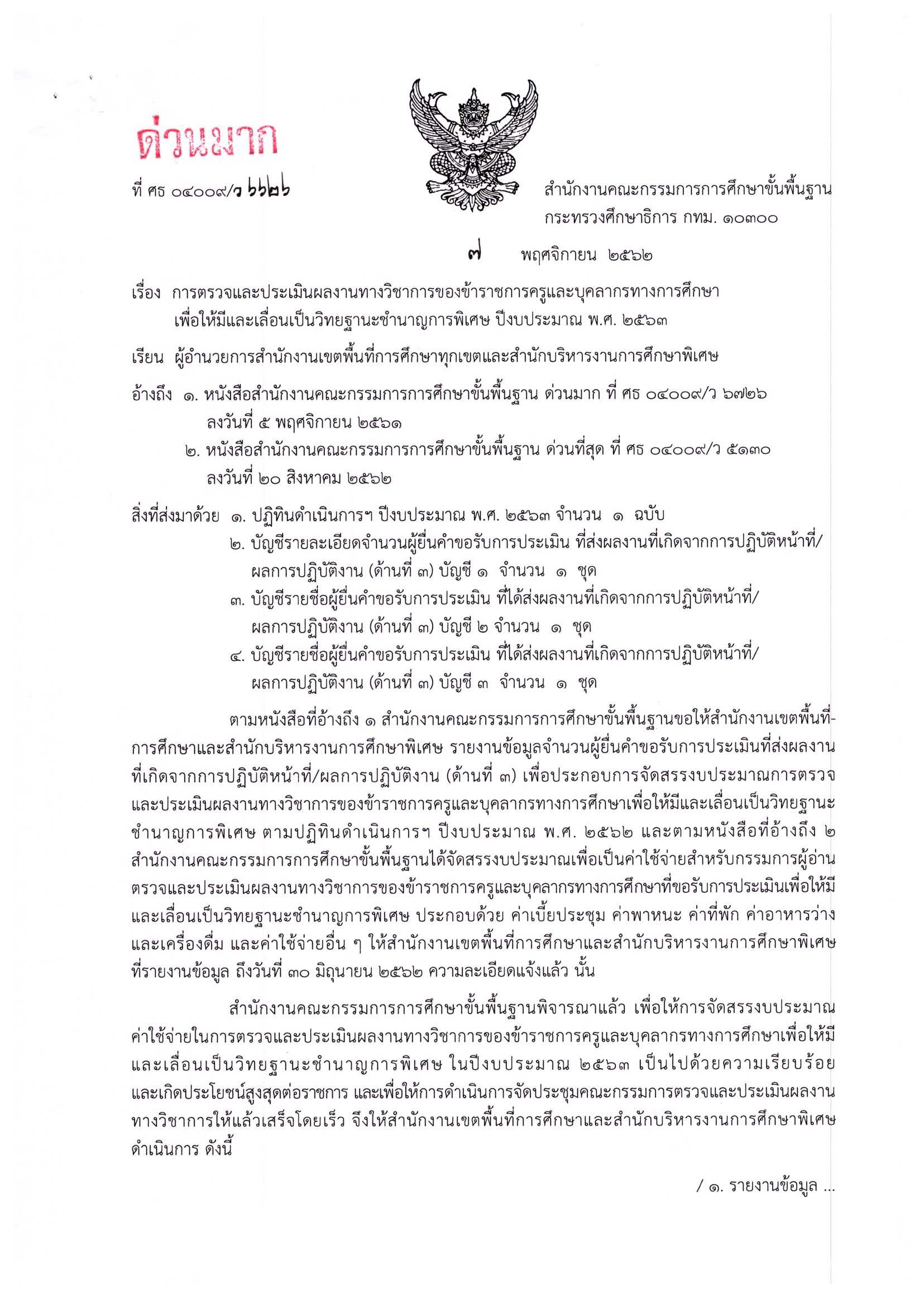ด่วนมาก ที่ ศธ 04009/ว 6626 เรื่อง การตรวจและประเมินผลงานทางวิชาการของข้าราชการครูและบุคลากรทางการศึกษาเพื่อให้มีและเลื่อนเป็นวิทยฐานะชำนาญการพิเศษ ปีงบประมาณ พ.ศ. 2563