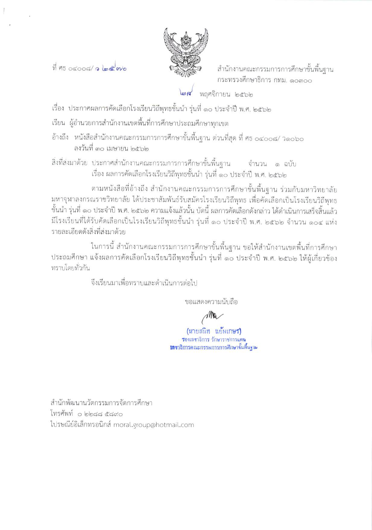 ประกาศผลการคัดเลือกโรงเรียนวิถีพุทธชั้นนำ รุ่นที่ 10 ประจำปี พ.ศ.2562