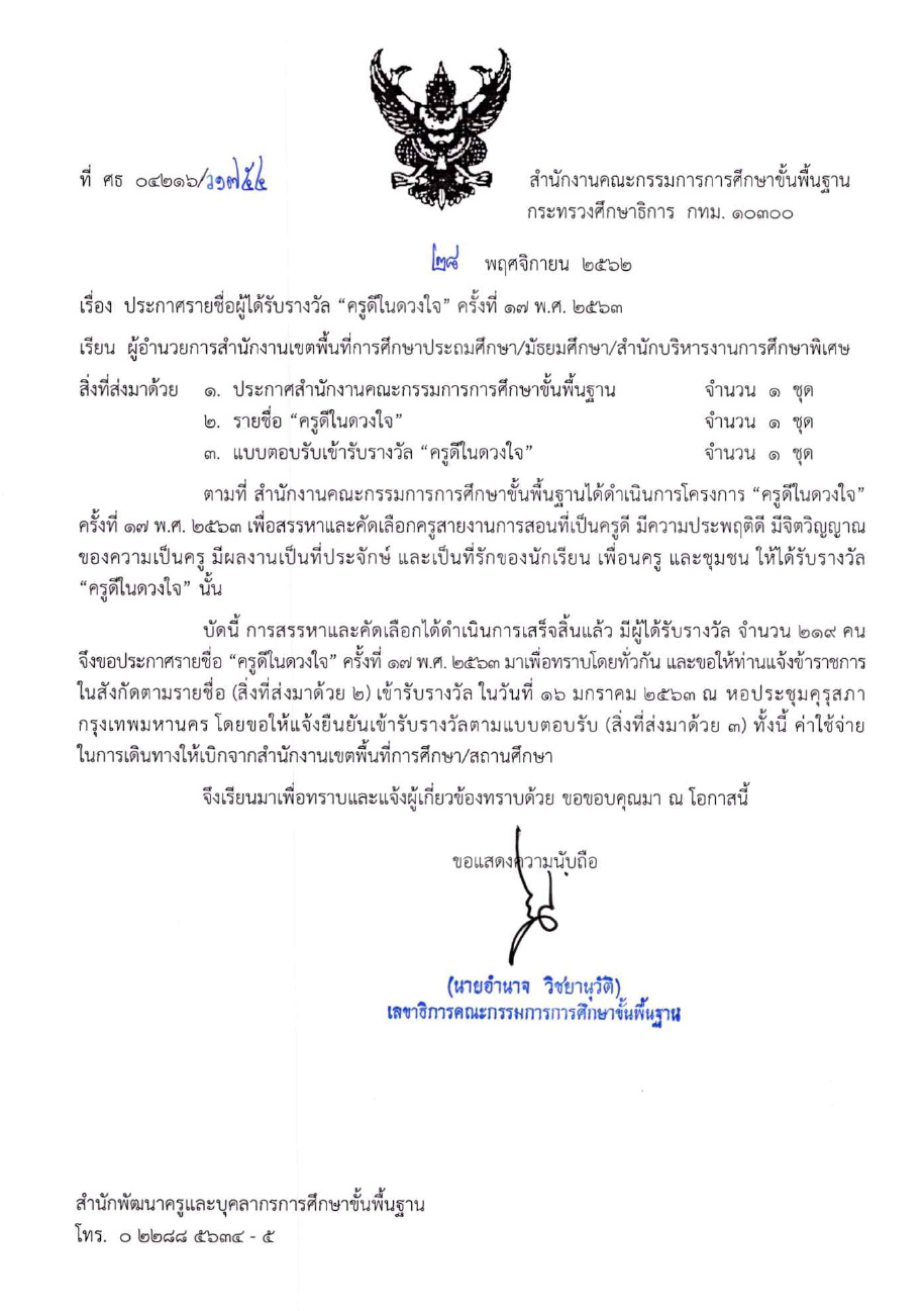 ประกาศรายชื่อผู้ได้รับรางวัล “ครูดีในดวงใจ” ครั้งที่ 17 พ.ศ.2563