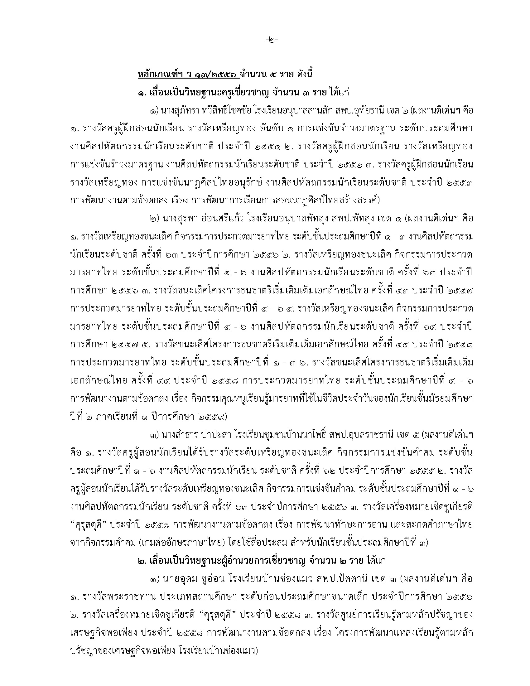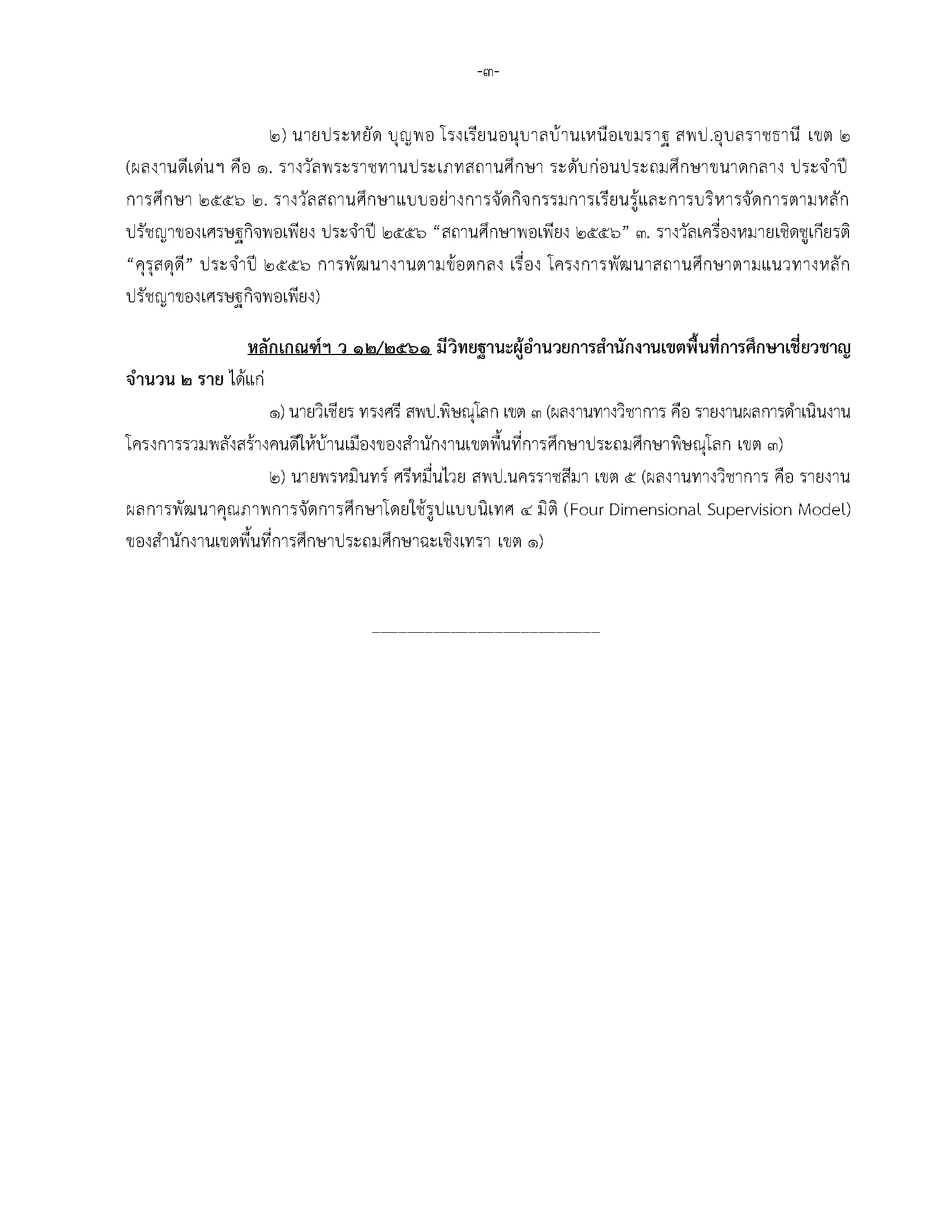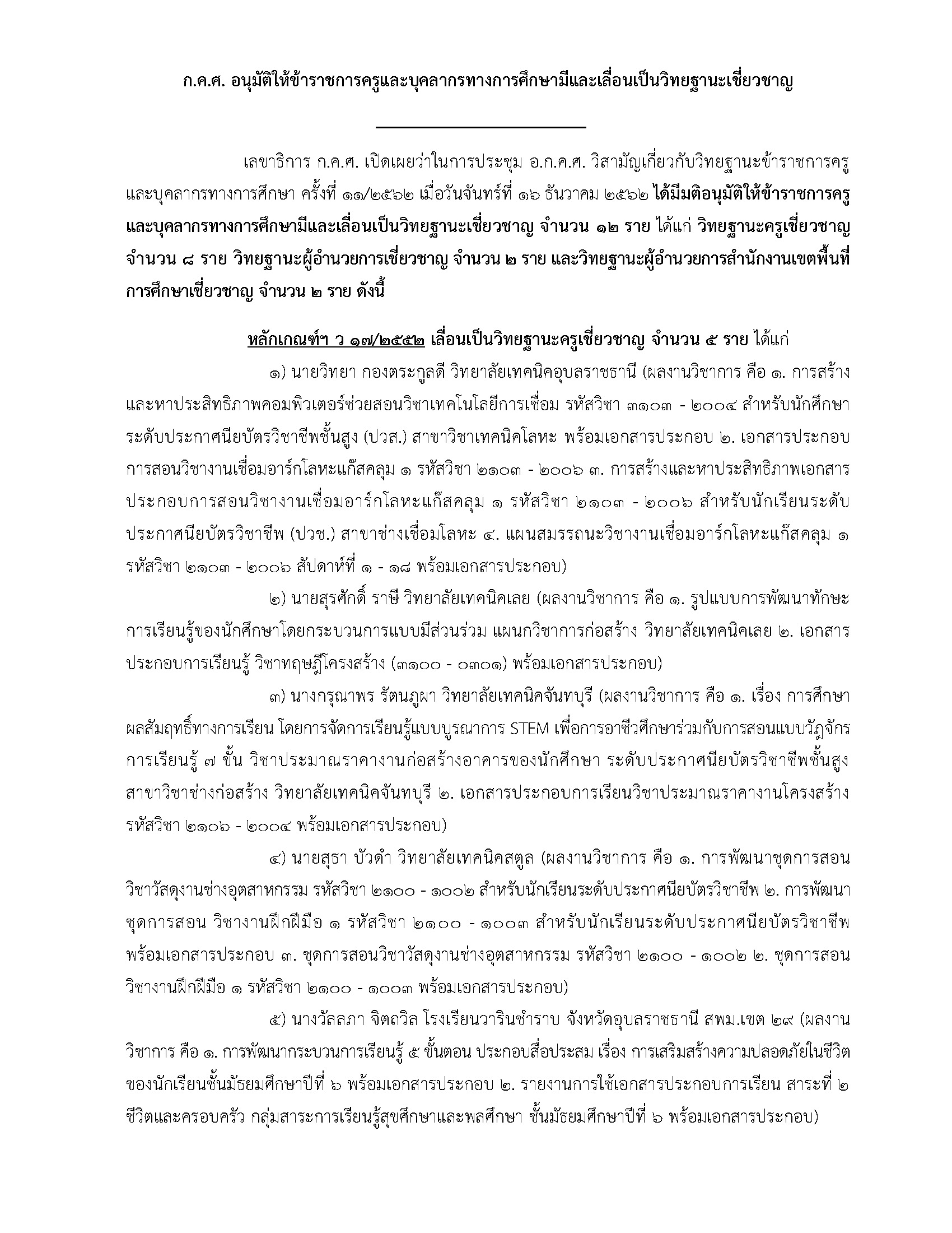 เลขาธิการ ก.ค.ศ. เปิดเผยว่าในการประชุม อ.ก.ค.ศ. วิสามัญเกี่ยวกับวิทยฐานะข้าราชการครู และบุคลากรทางการศึกษา ครั้งที่ 11/2562 เมื่อวันจันทร์ที่ 16 ธันวาคม 2562 ได้มีมติอนุมัติให้ข้าราชการครู และบุคลากรทางการศึกษามีและเลื่อนเป็นวิทยฐานะเชี่ยวชาญ จํานวน 12 ราย ได้แก่ วิทยฐานะครูเชี่ยวชาญ จํานวน 8 ราย วิทยฐานะผู้อํานวยการเชี่ยวชาญ จํานวน 2 ราย และวิทยฐานะผู้อํานวยการสํานักงานเขตพื้นที่ การศึกษาเชี่ยวชาญ จํานวน 2 ราย ดังนี้