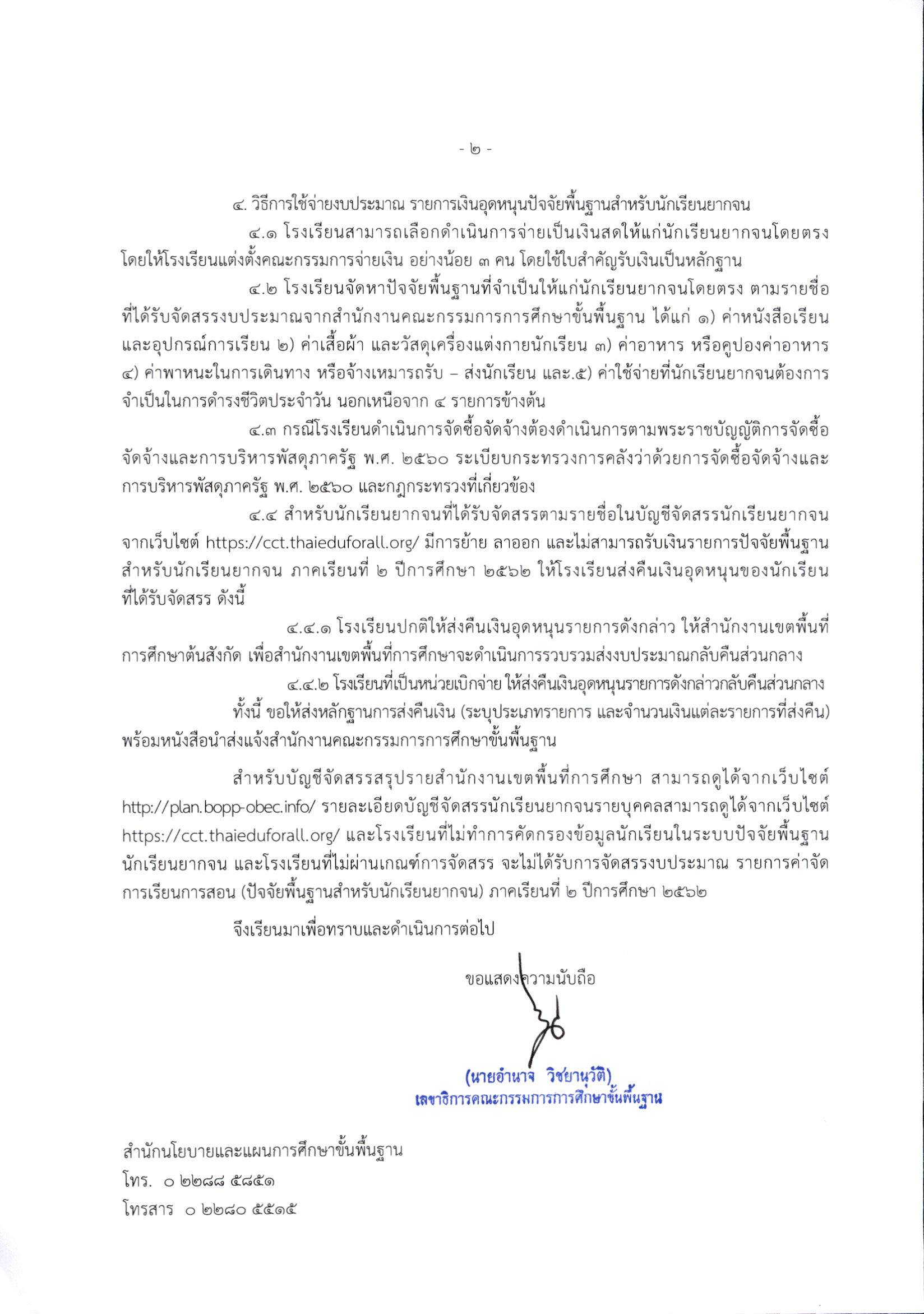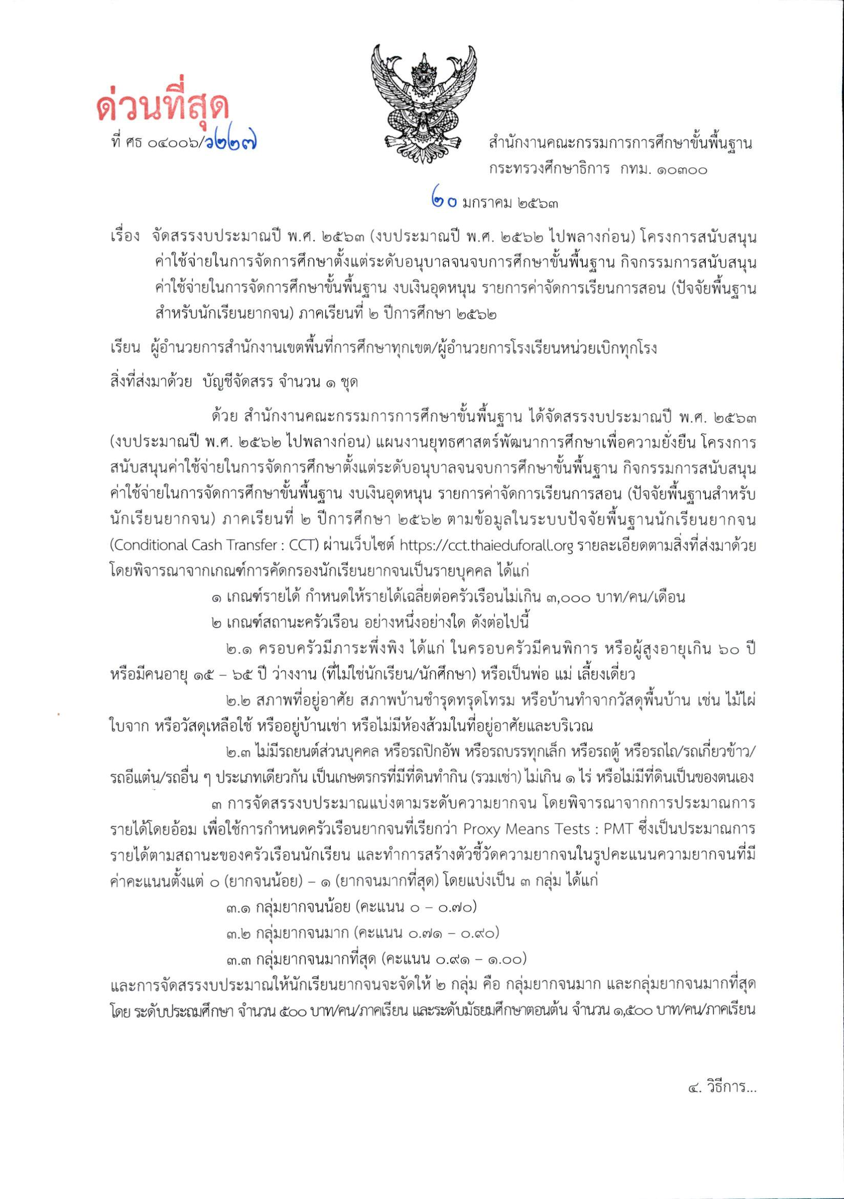 สำนักงานคณะกรรมการการศึกษาขั้นพื้นฐาน มีหนังสือ แจ้งจัดสรรงบประมาณปี พ.ศ. 2563 (งบประมาณปี พ.ศ. 2562 ไปพลางก่อน) งบเงินอุดหนุน รายการค่าจัดการเรียนการสอน (ปัจจัยพื้นฐานสำหรับนักเรียนยากจน) ภาคเรียนที่ 2 ปีการศึกษา 2562 รายละเอียด ดังนี้