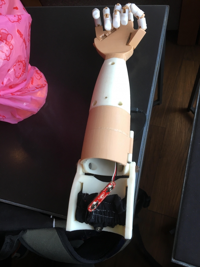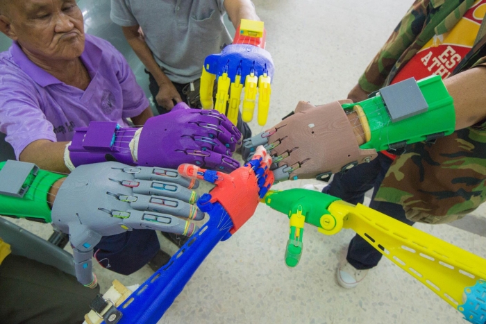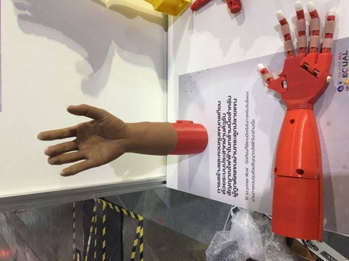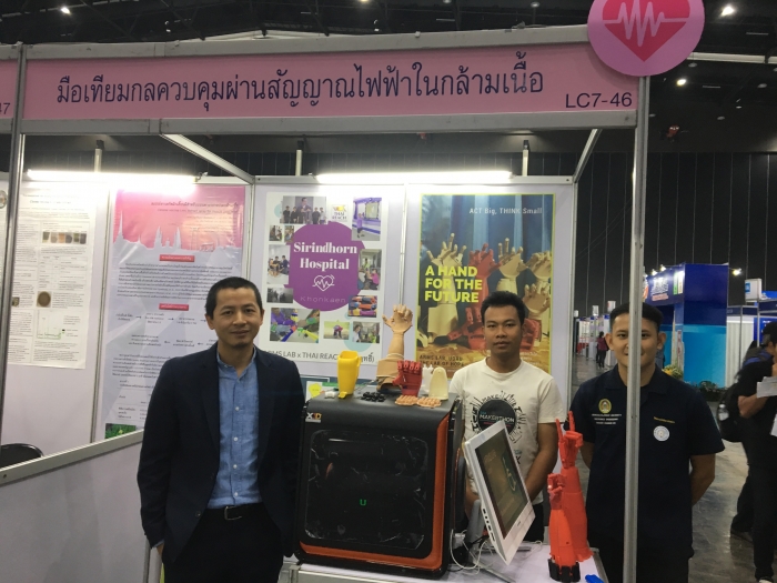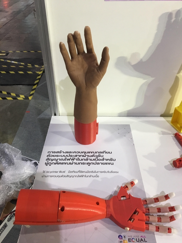 “การวิจัยมือเทียมกล ทีมวิจัยได้พัฒนา 2 ส่วน คือ 1. การสร้างแพลตฟอร์มสำหรับการพัฒนากายอุปกรณ์ในการพิมพ์มือเทียมกลจากเครื่องพิมพ์ 3 มิติ โดยทีมวิจัยออกแบบและใช้เครื่องพิมพ์ 3 มิติ พิมพ์มือเทียมกลให้มีความหลากหลายเหมาะกับคนพิการได้แล้ว 10 รูปแบบ (ออกแบบมือเทียมกลฯ ตั้งแต่ข้อมือ กลางมือ ตอข้อศอก และเหนือข้อศอก โดยแบ่งข้างซ้ายกับขวารวมเป็น 10 แบบ) จากเคสคนพิการ 12 ราย ซึ่งนำไปใช้กับคนพิการได้เลย และ 2. การสร้างแพลตฟอร์มสัญญาณควบคุมด้วยการใช้เซ็นเซอร์ตัววัดสัญญาณไฟฟ้าในกล้ามเนื้อของคนพิการ เป็นการสร้างแพลตฟอร์มใหม่ที่ทำหน้าที่ตรวจจับสัญญาณสั่งการจากสมอง เป็นสัญญาณไฟฟ้าผ่านกล้ามเนื้อแขน