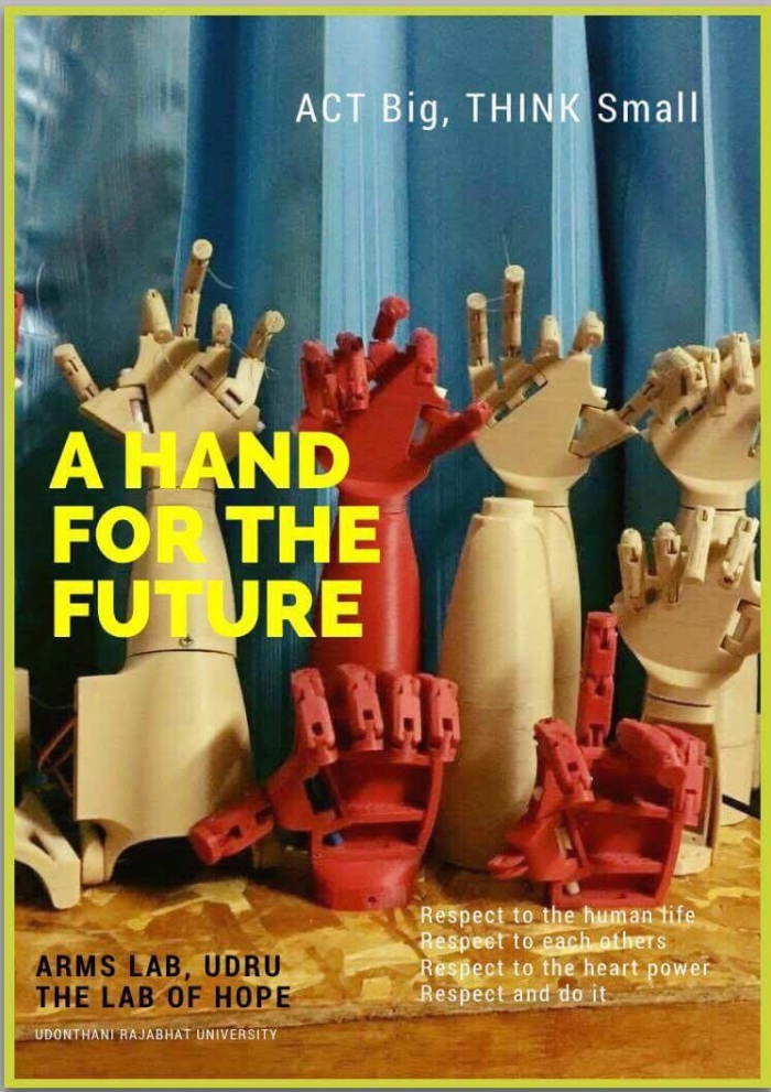 ผศ.ดร.นพรัตน์ ธรรมวงษา อาจารย์สาขาวิชาวิศวกรรมอิเล็กทรอนิกส์และระบบอัตโนมัติ มหาวิทยาลัยราชภัฏอุดรธานี และทีมวิจัย พัฒนา ‘โครงการสร้างมือเทียมกลควบคุมผ่านตัวรับสัญญาณไฟฟ้าในกล้ามเนื้อ’ ภายใต้การสนับสนุนของสำนักงานคณะกรรมการส่งเสริมวิทยาศาสตร์ วิจัยและนวัตกรรม (สกสว.)